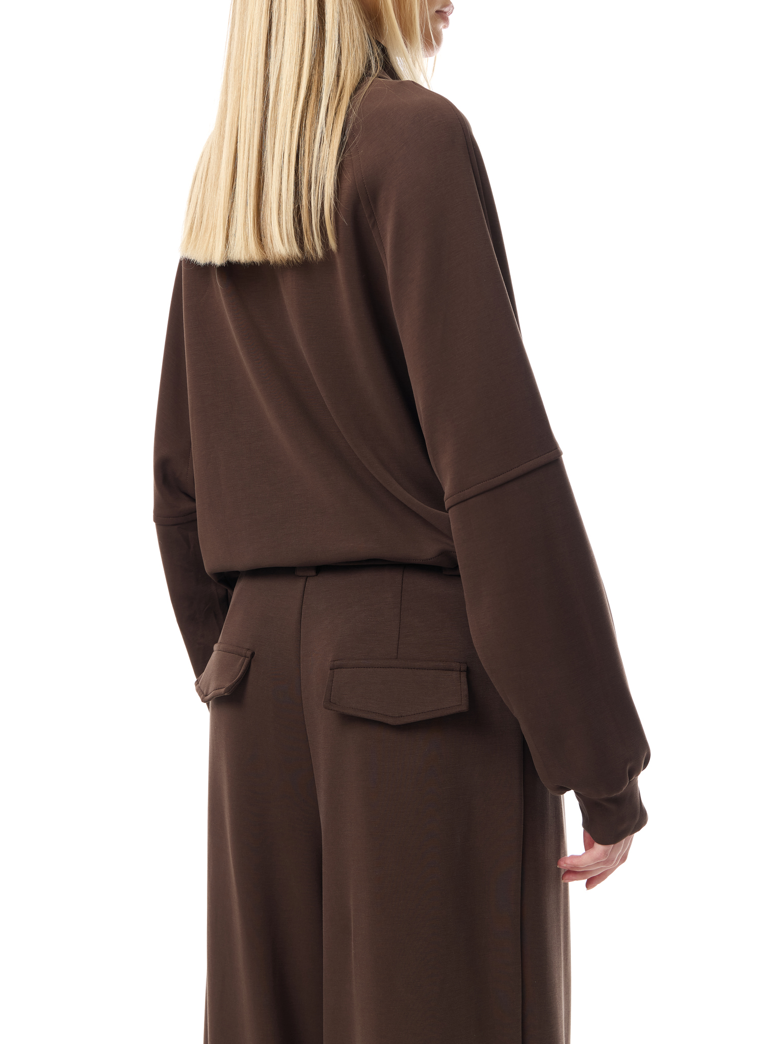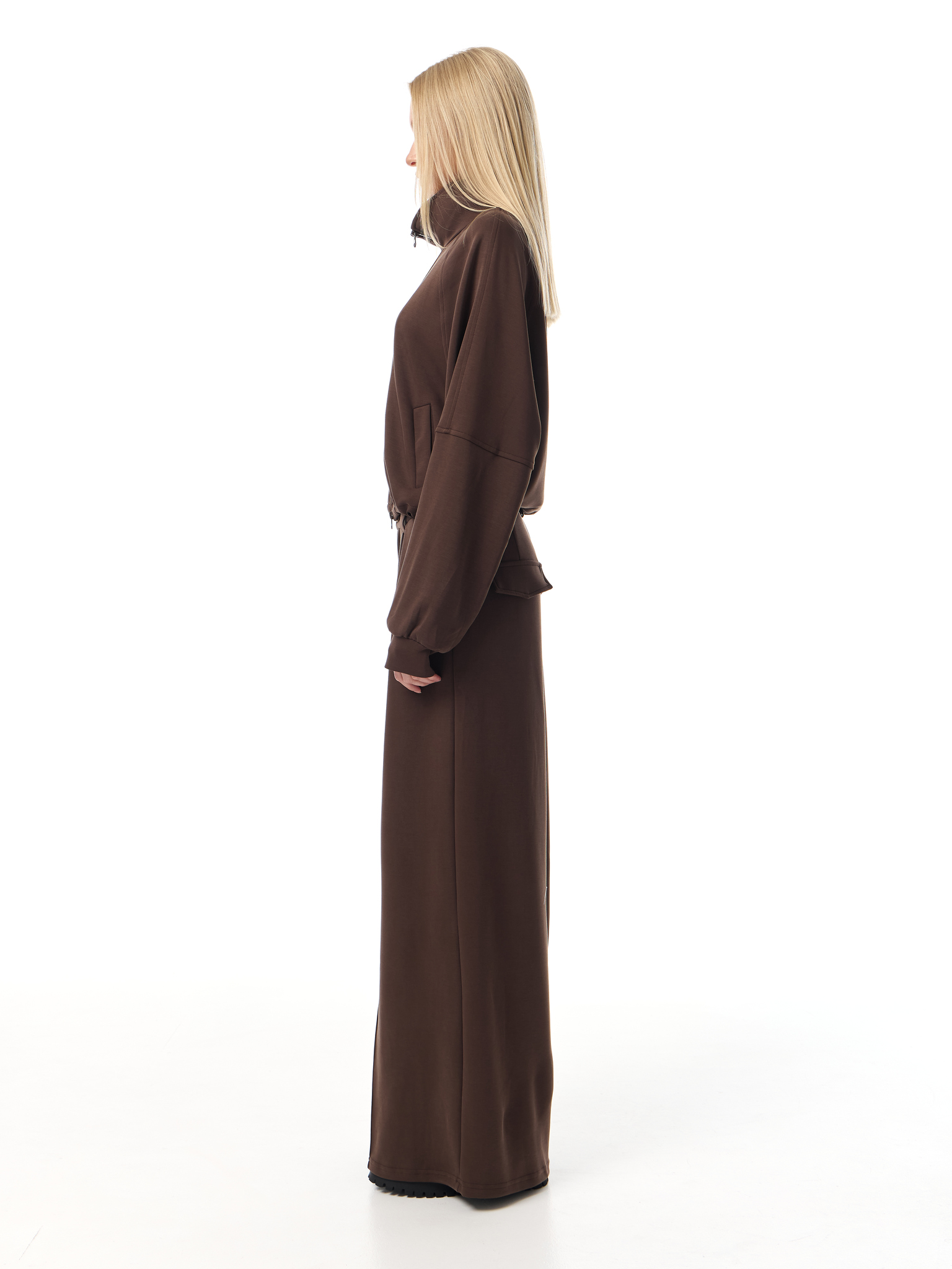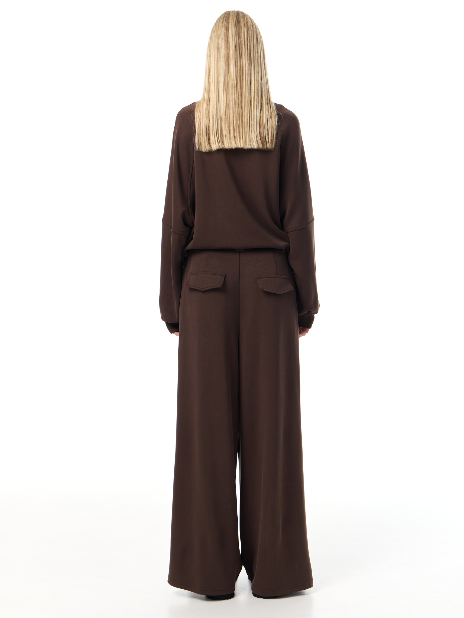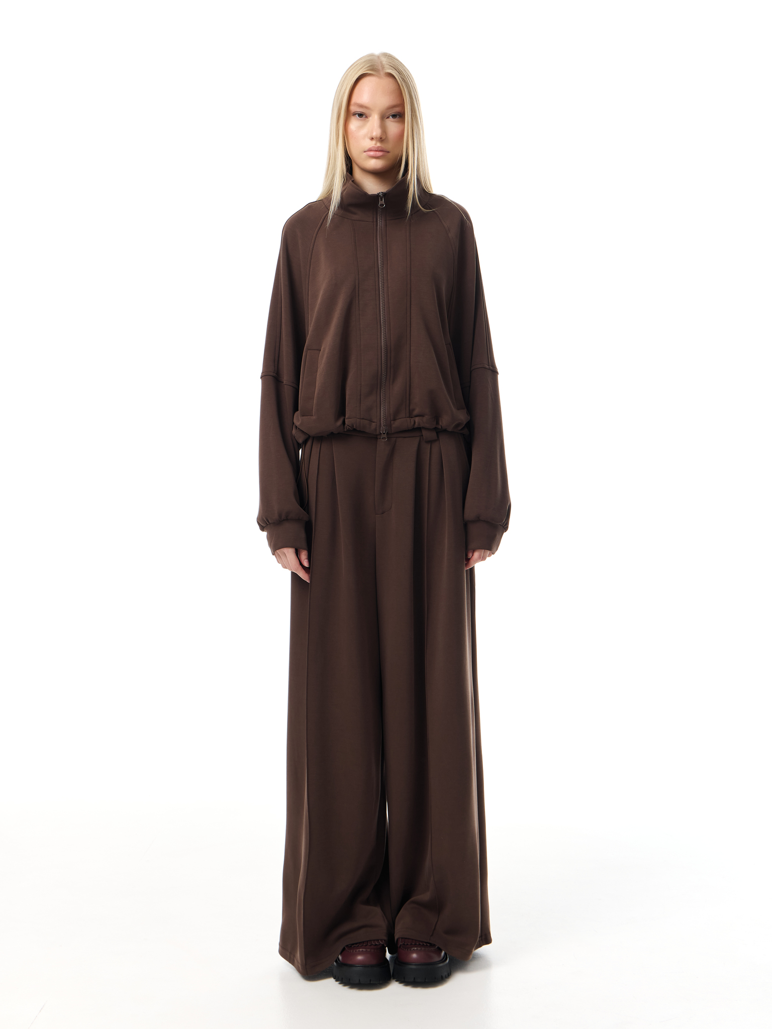 Брюки широкого кроя из мягкого трикотажа. Посадка на талии дополнена защипами и застёжкой на молнию с пуговицей. Широкие прямые брючины формируют выразительный силуэт, подчёркивая свободу движения и комфорт.