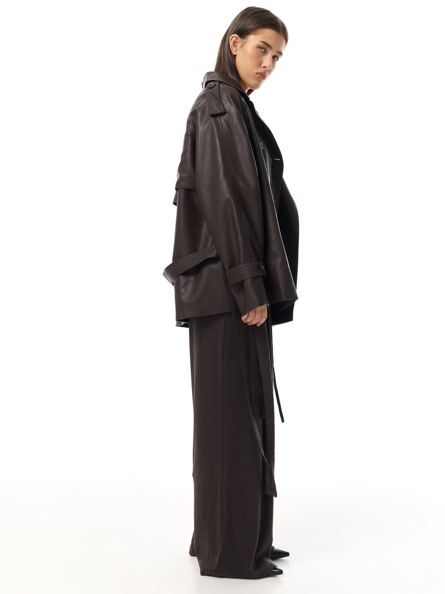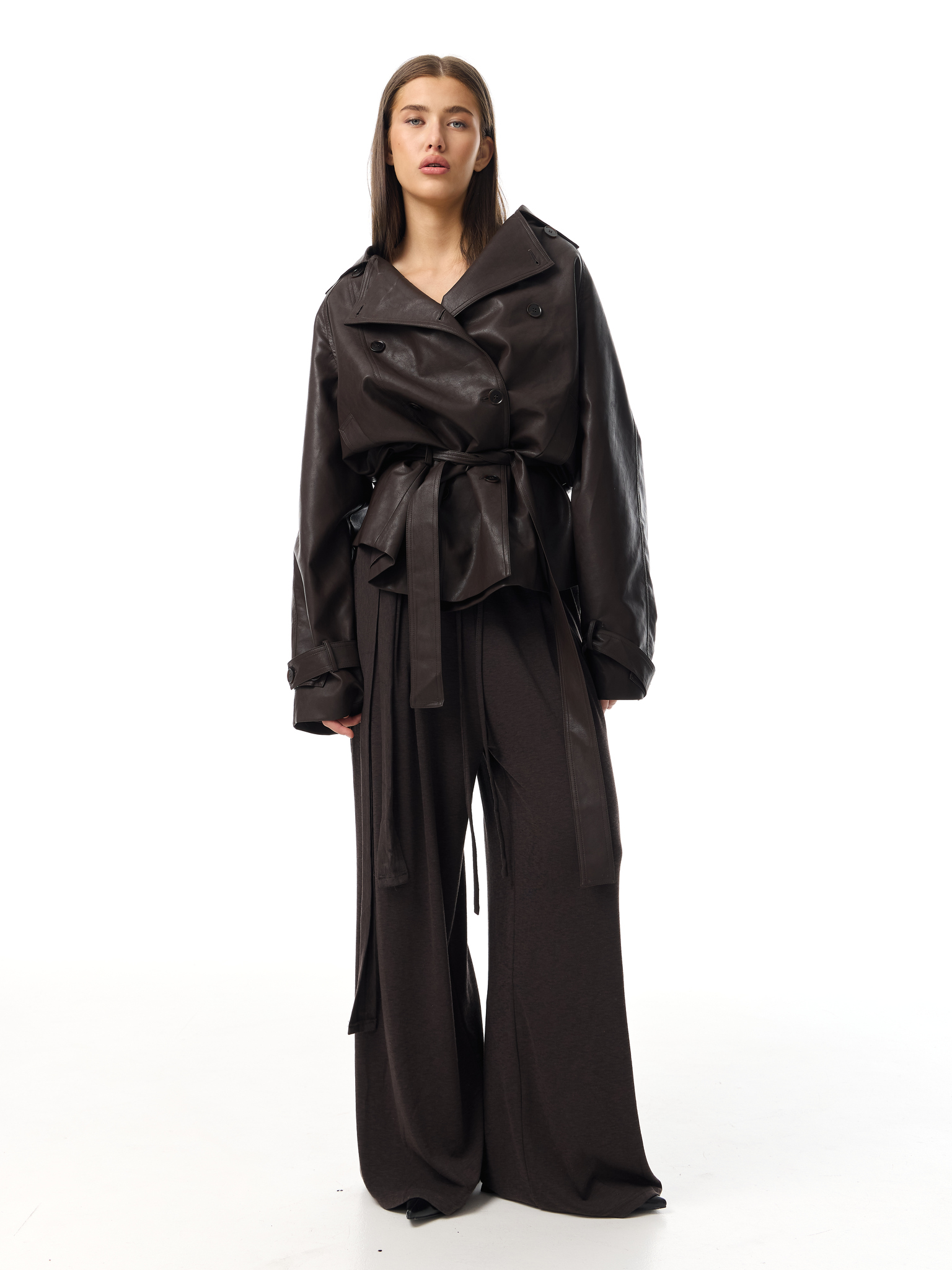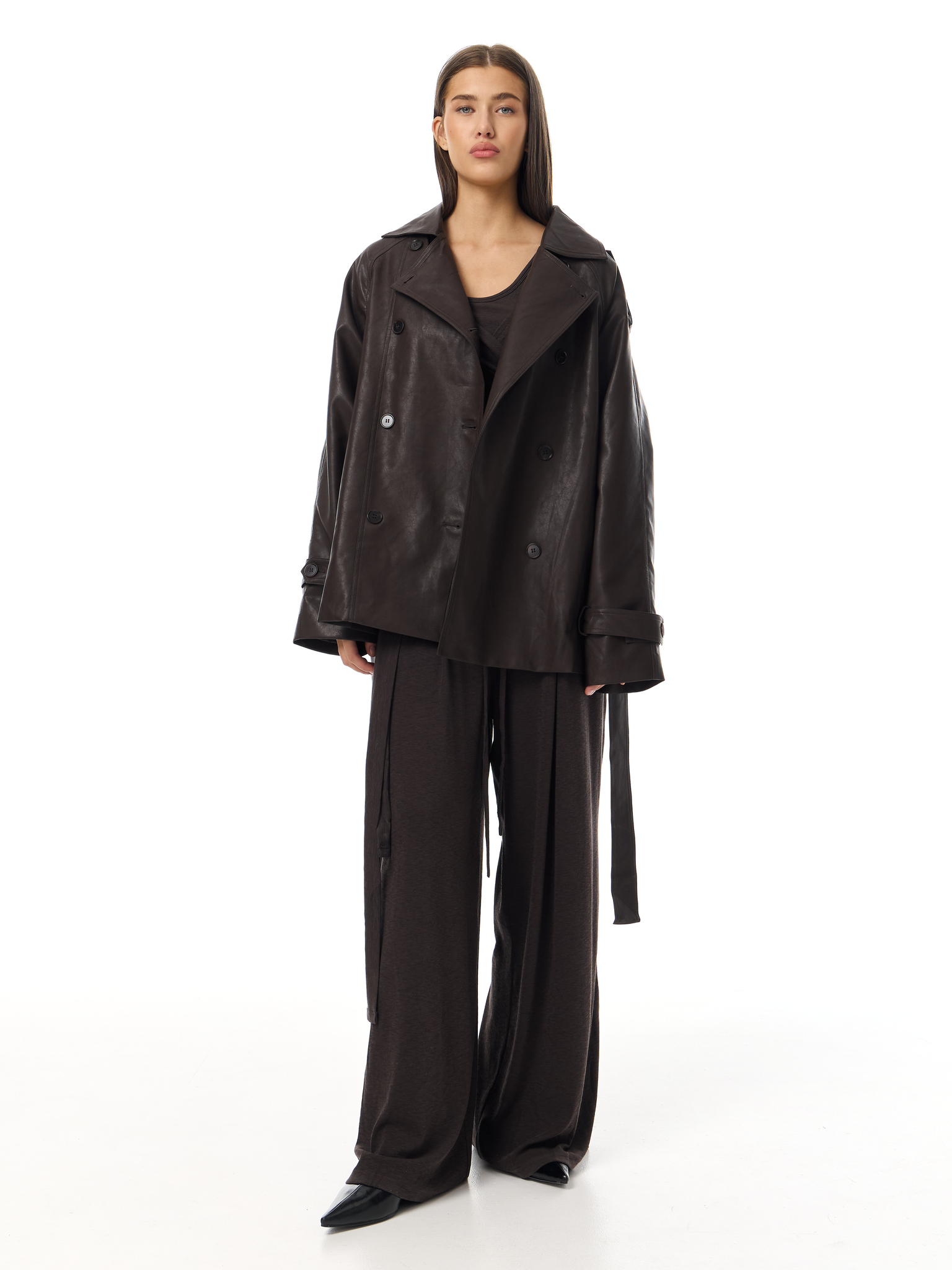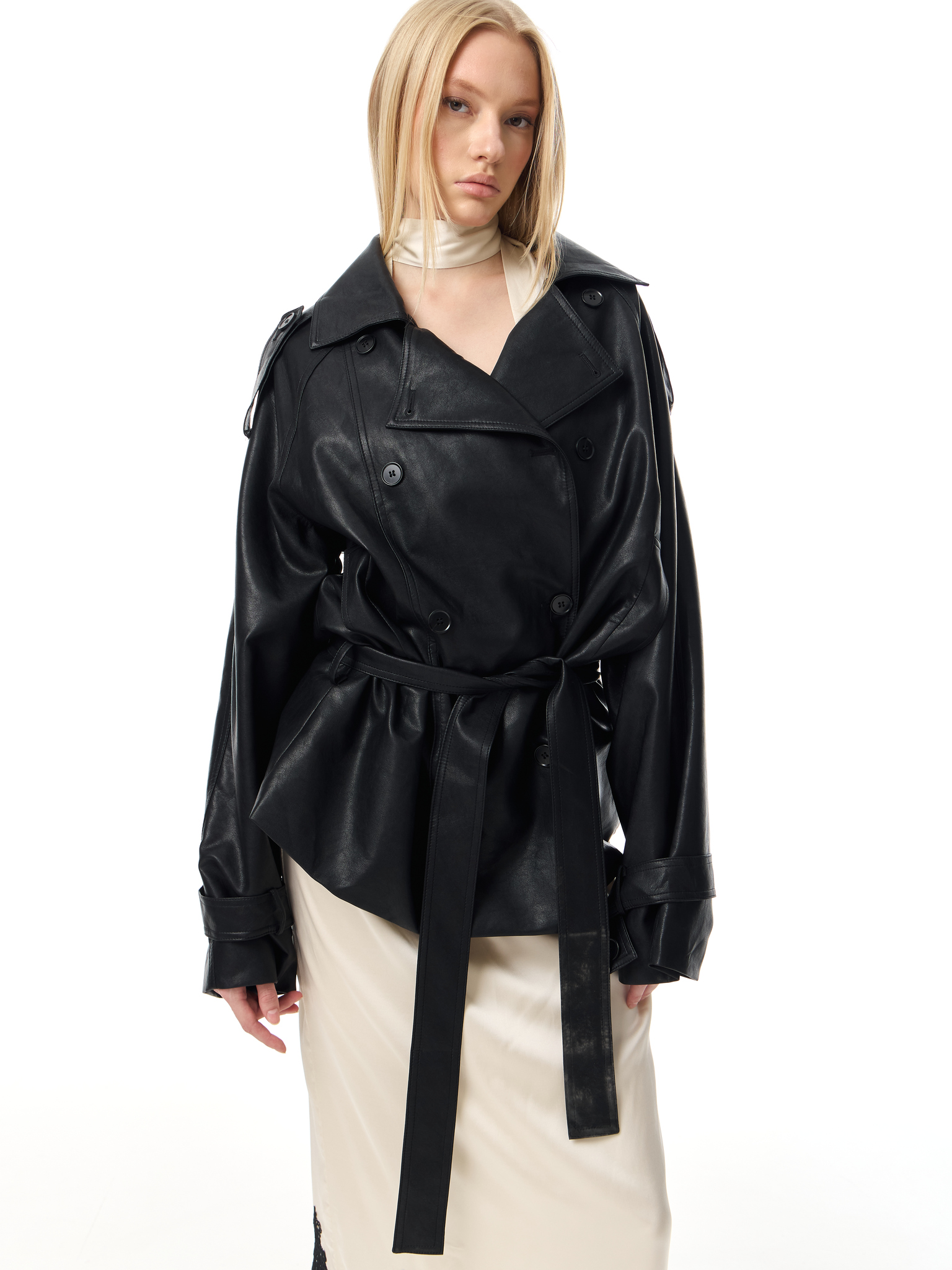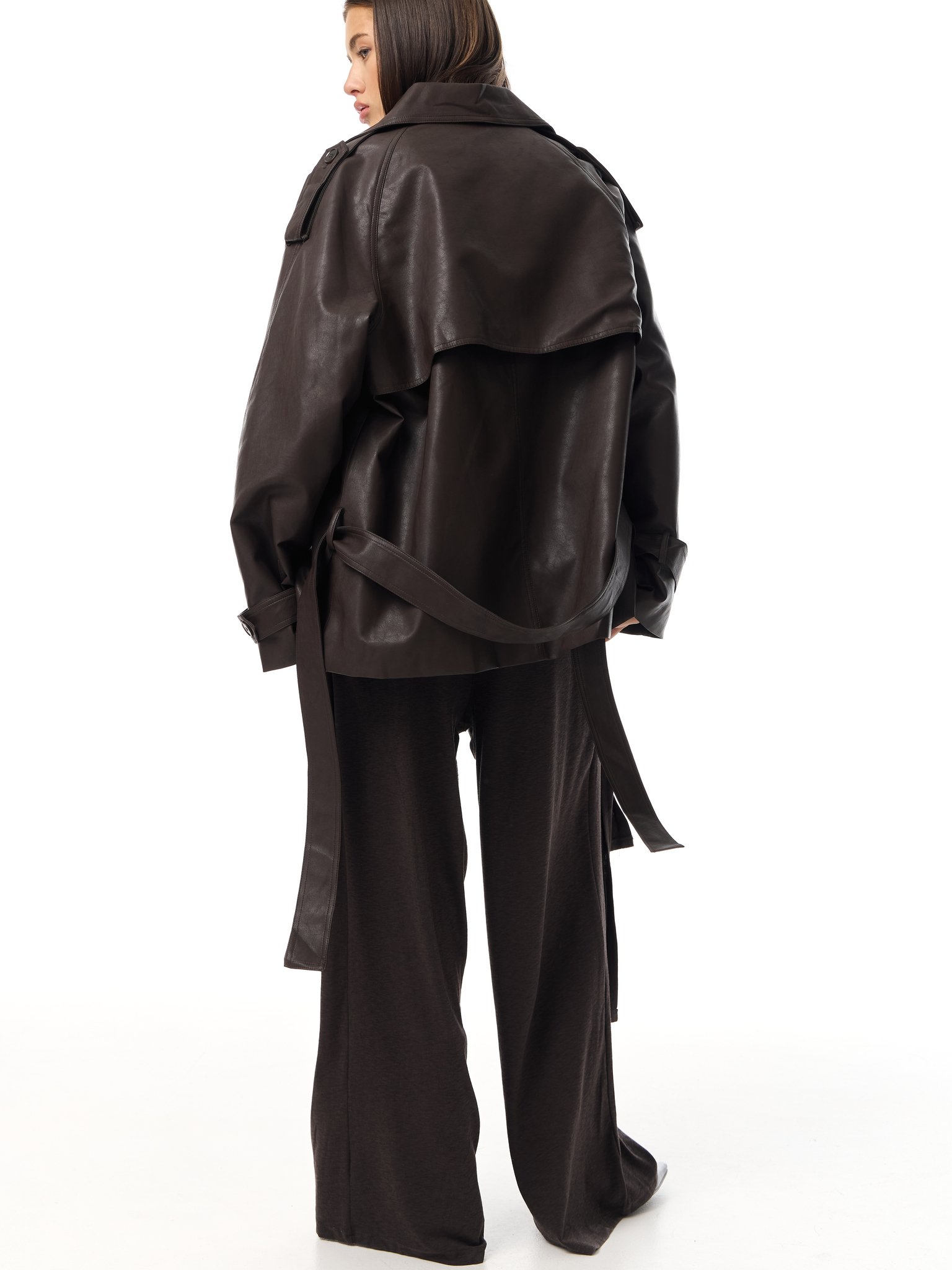 Укороченный тренч из мягкой эко-кожи — современное переосмысление классики. Свободный силуэт с акцентным поясом и двубортной застёжкой подчёркивает линию талии, а укорочённая длина придаёт лёгкость и динамику образу. Тренч дополнен погонами и хлястиками на рукавах, что отсылает к традиционным элементам кроя. Выполнен в универсальной палитре, которая легко сочетается как с повседневными, так и с вечерними аутфитами.