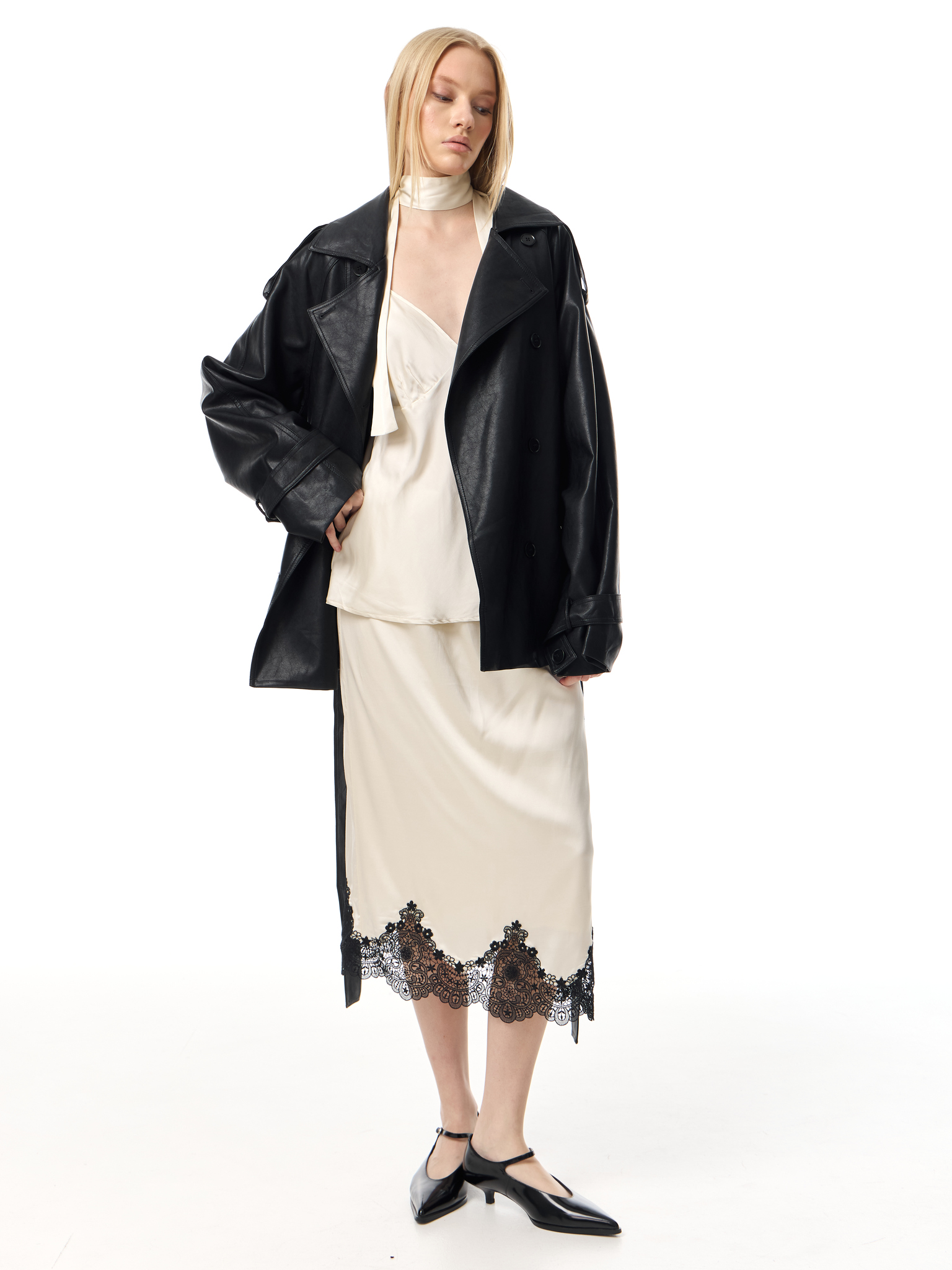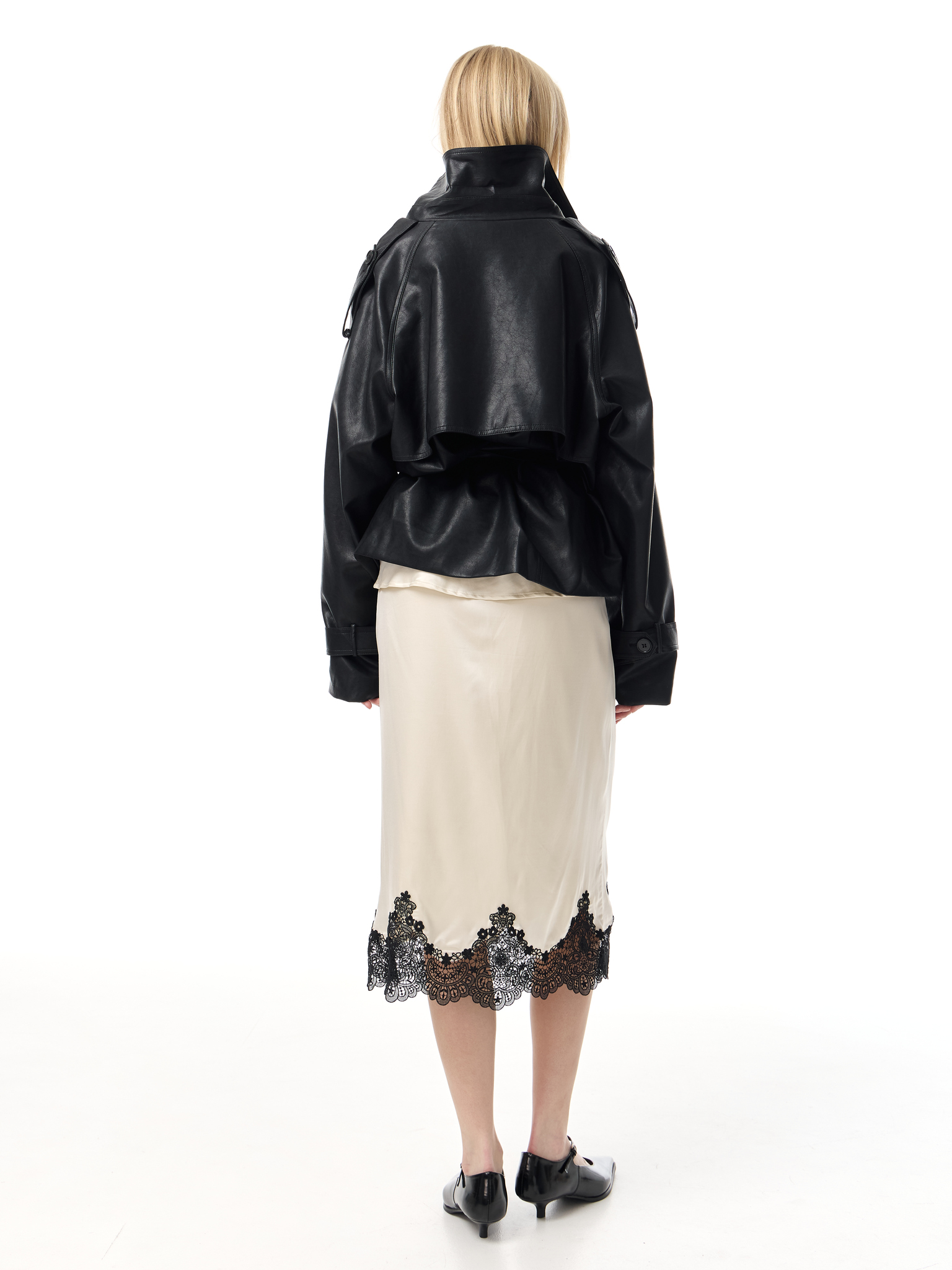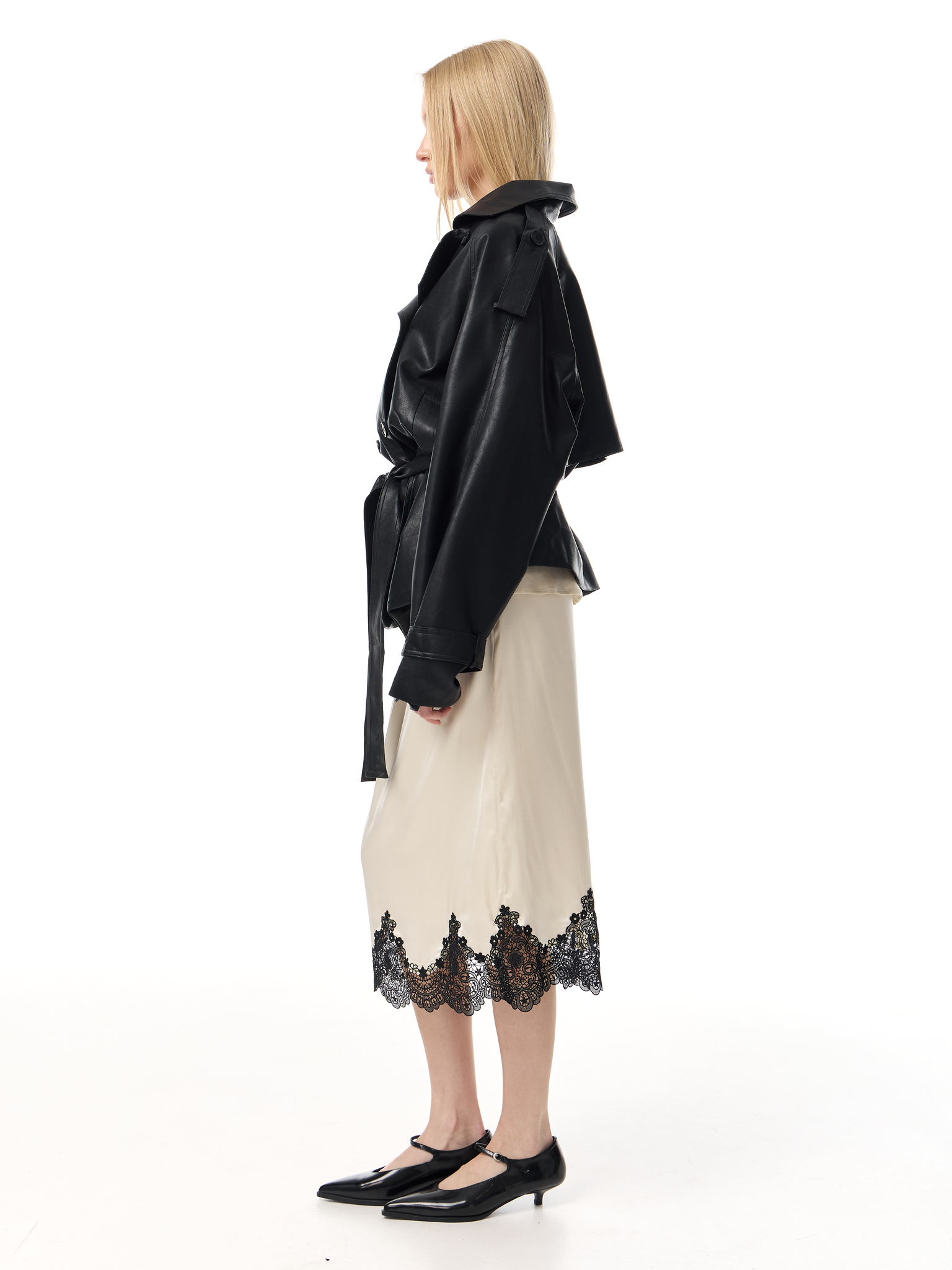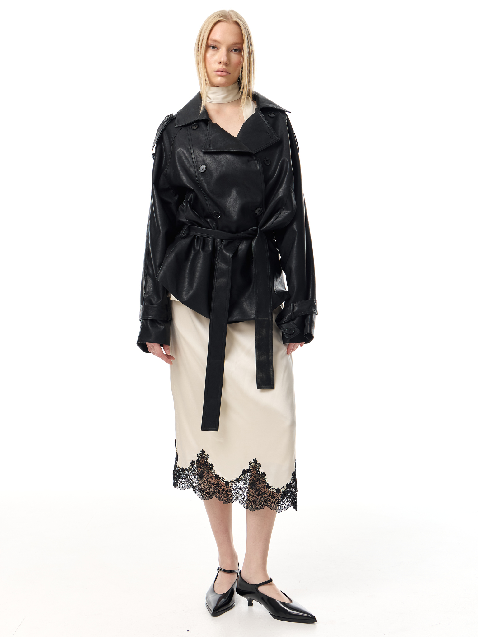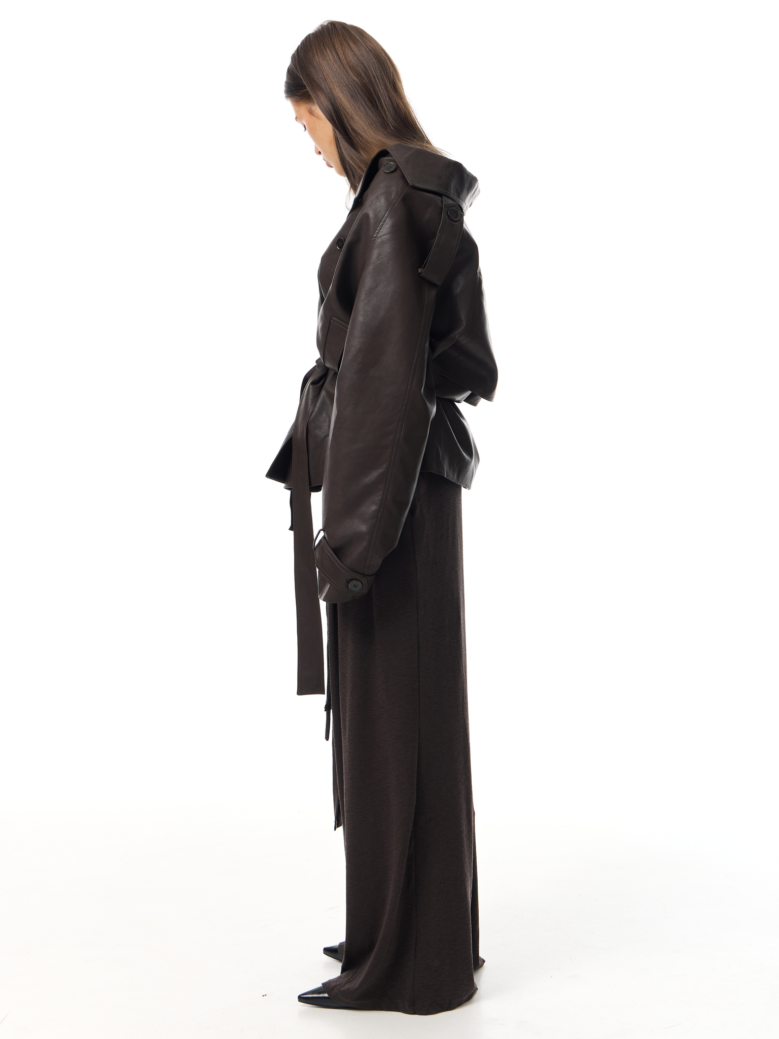 Укороченный тренч из мягкой эко-кожи — современное переосмысление классики. Свободный силуэт с акцентным поясом и двубортной застёжкой подчёркивает линию талии, а укорочённая длина придаёт лёгкость и динамику образу. Тренч дополнен погонами и хлястиками на рукавах, что отсылает к традиционным элементам кроя. Выполнен в универсальной палитре, которая легко сочетается как с повседневными, так и с вечерними аутфитами.