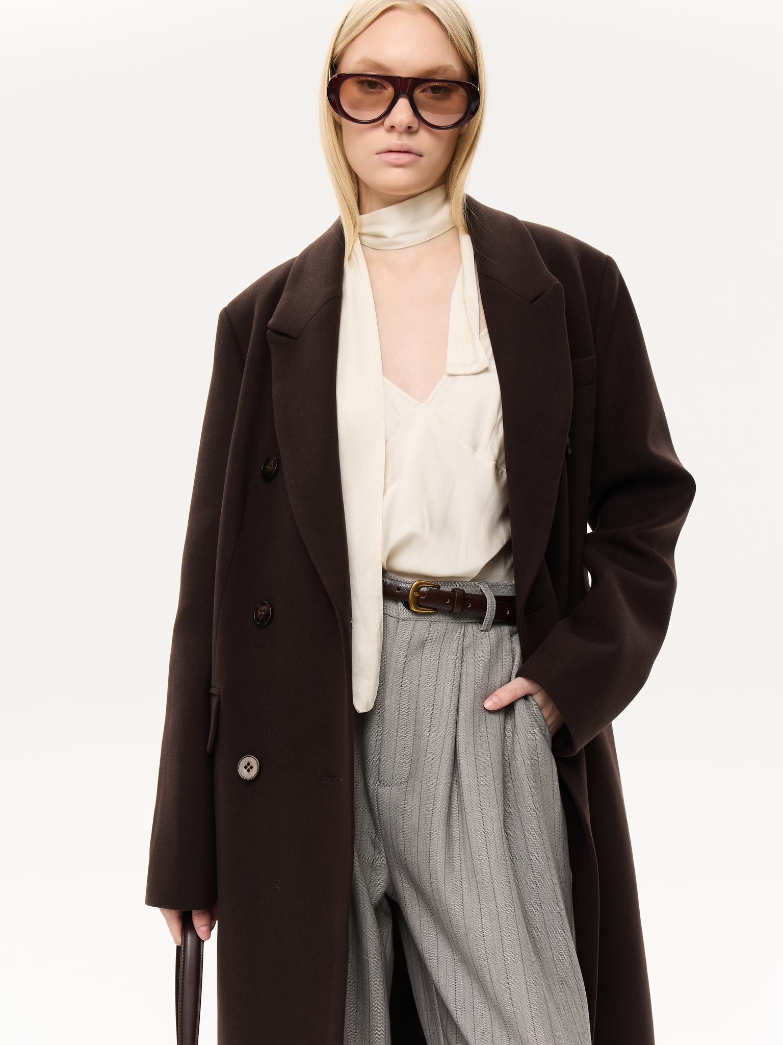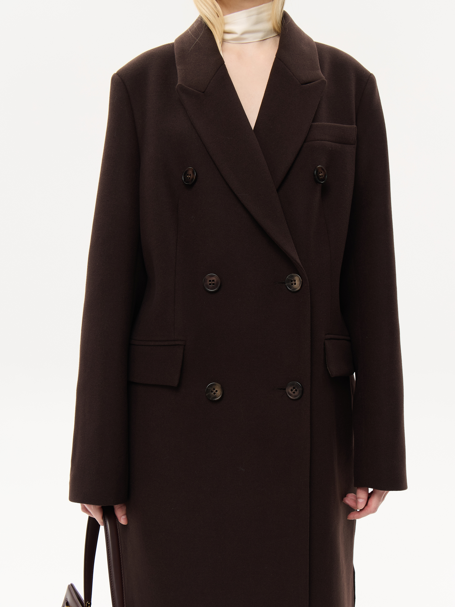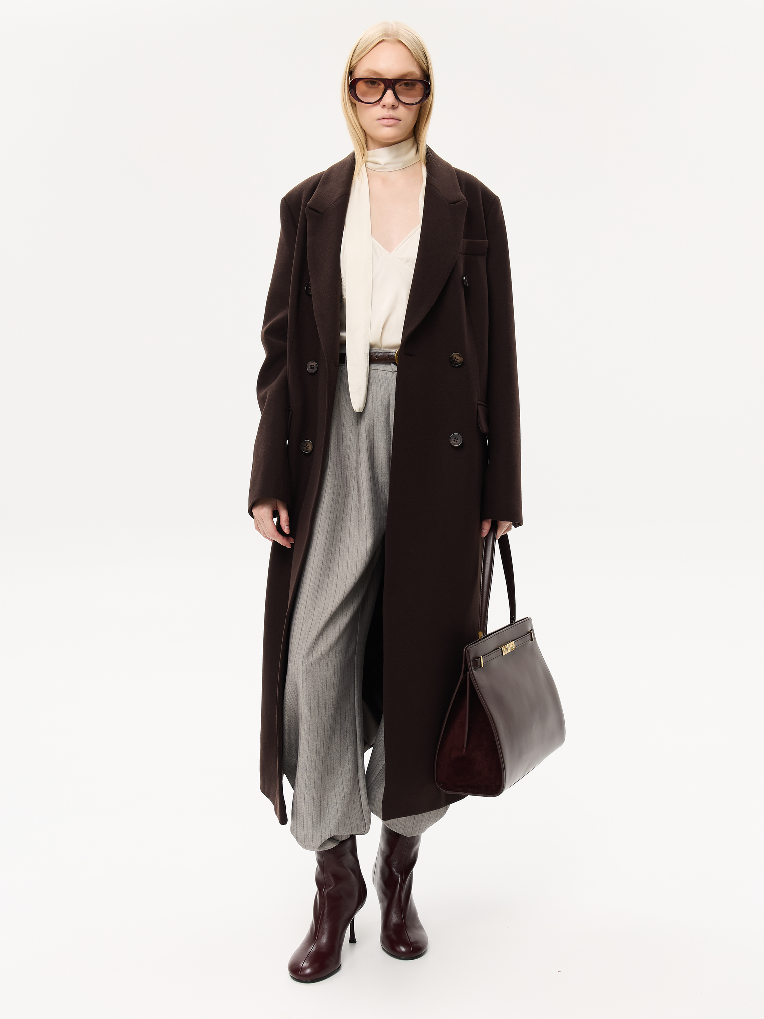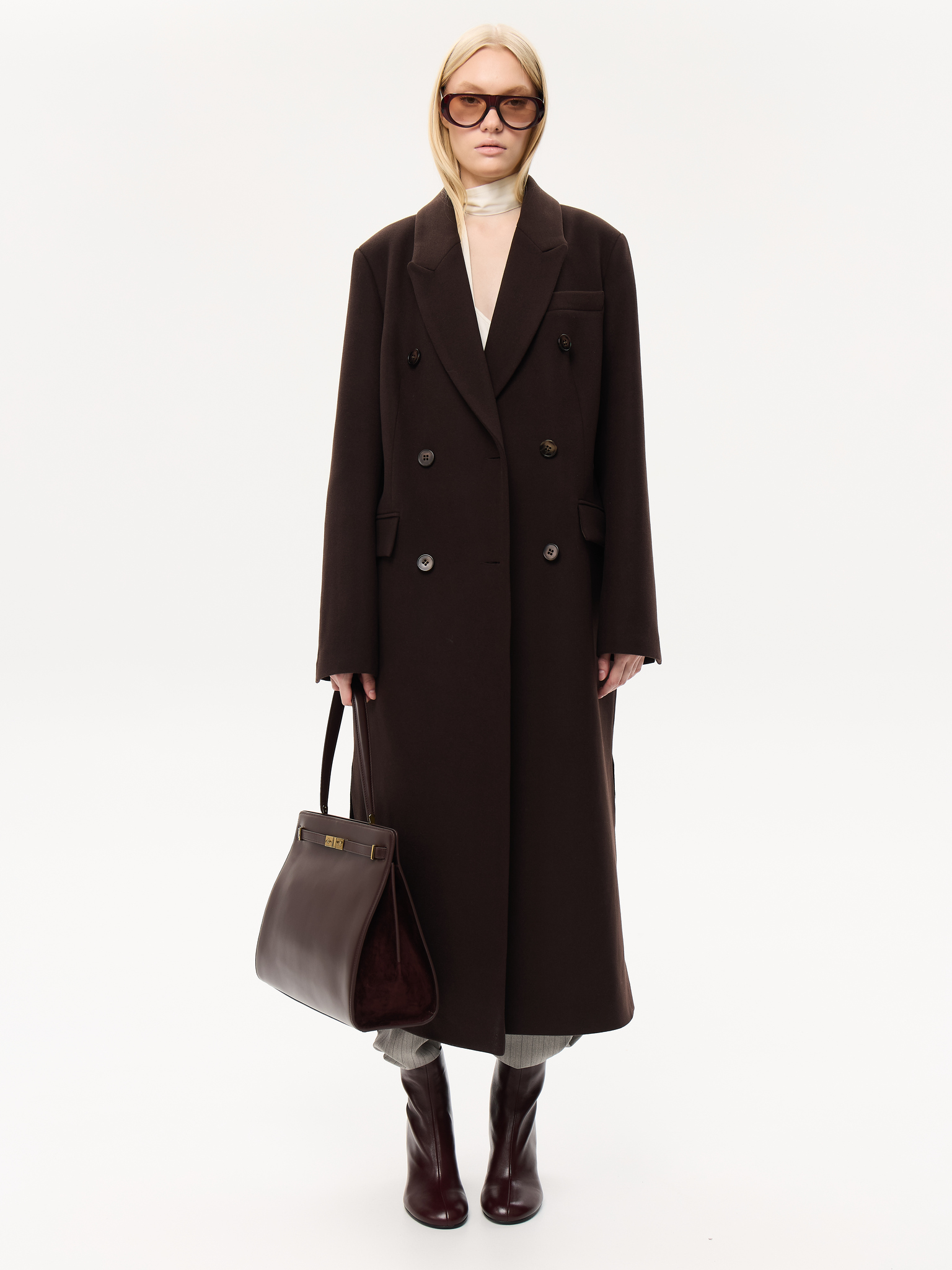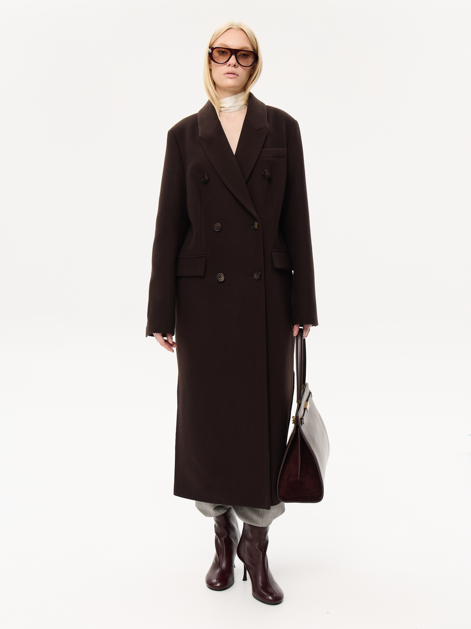 Двубортное пальто из плотной шерсти с чёткой вертикалью кроя. Аккуратные лацканы и строгая линия плеч подчеркивают графичность, а удлинённая форма вытягивает силуэт. Идеальный баланс структуры и мягкости ткани делает модель универсальной для образов в городе — от деловых до вечерних.