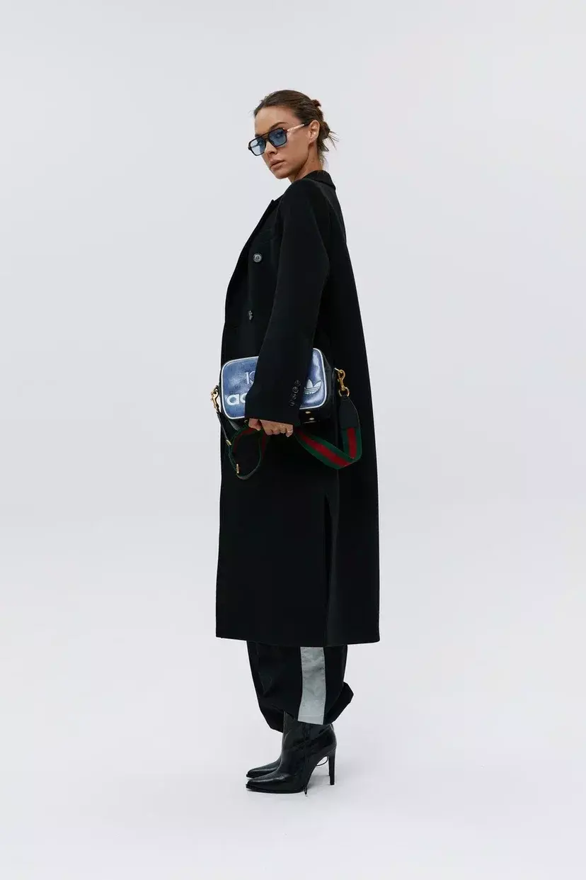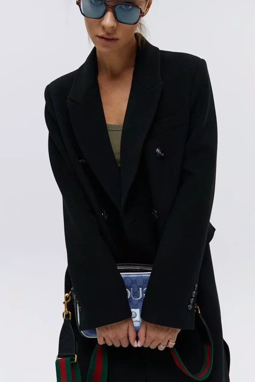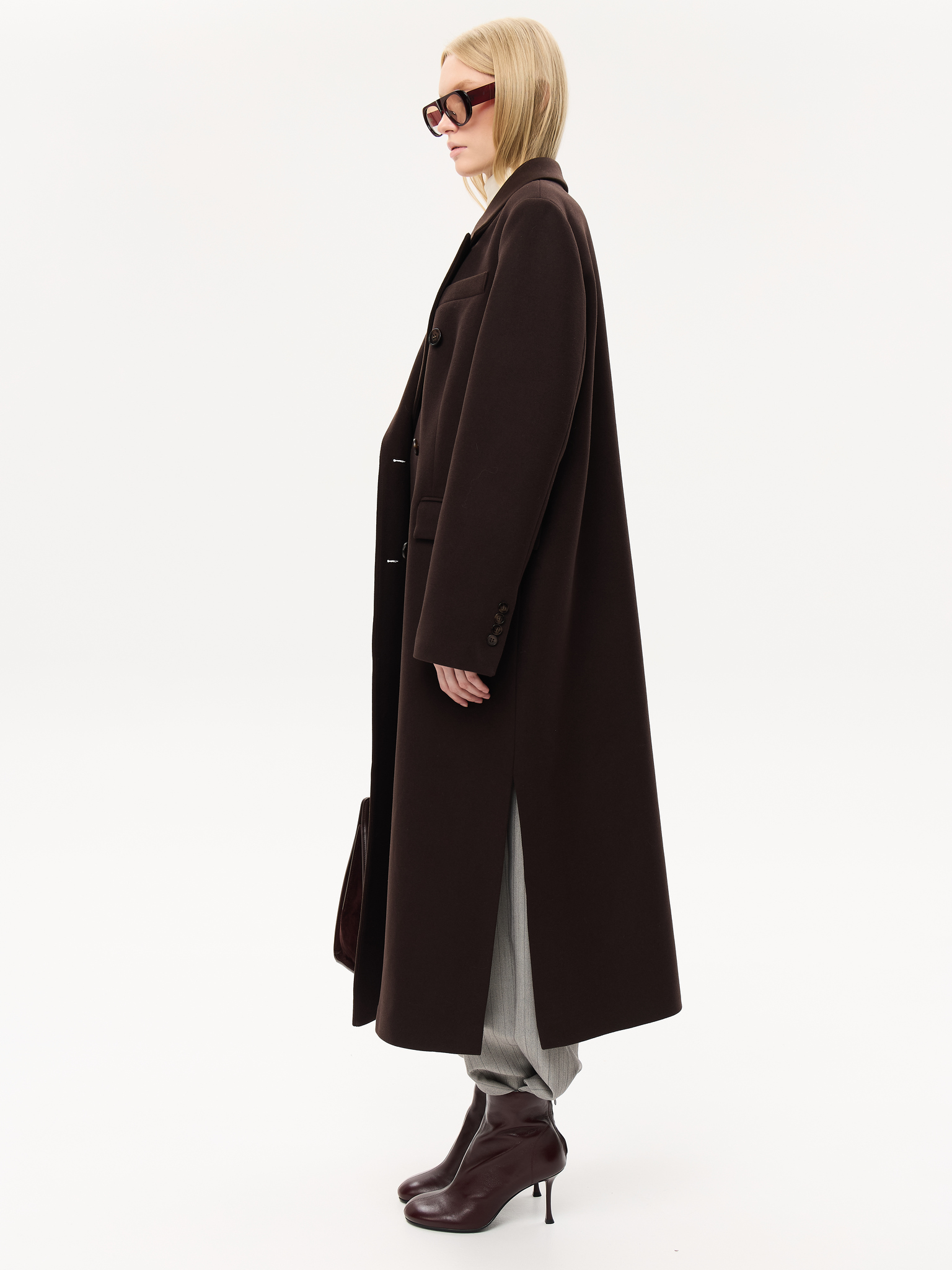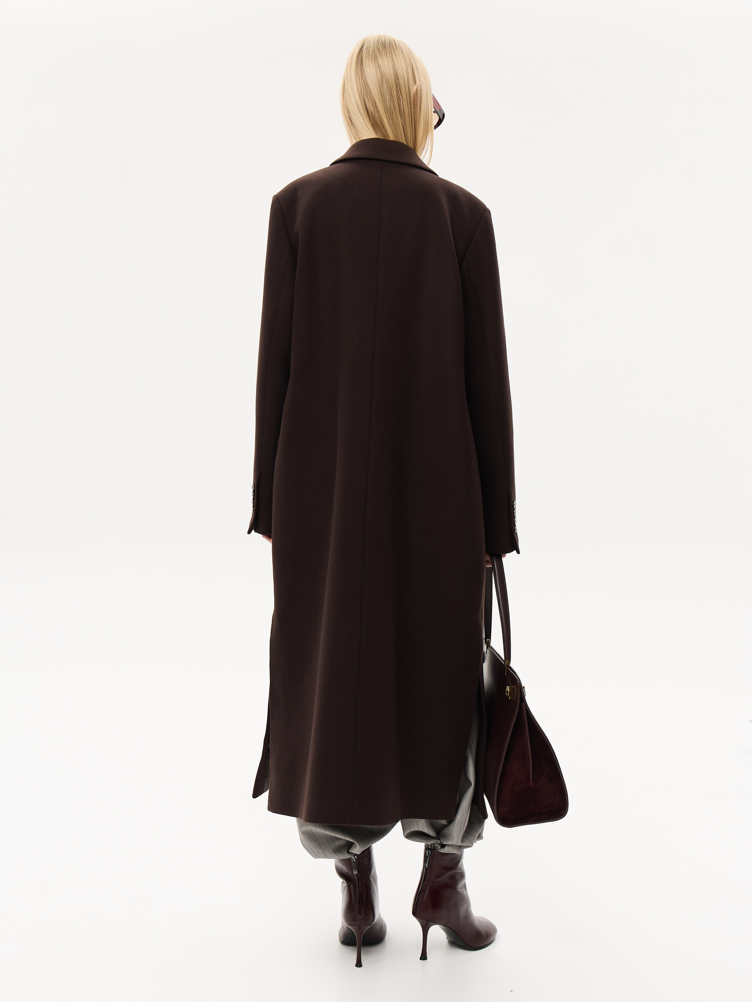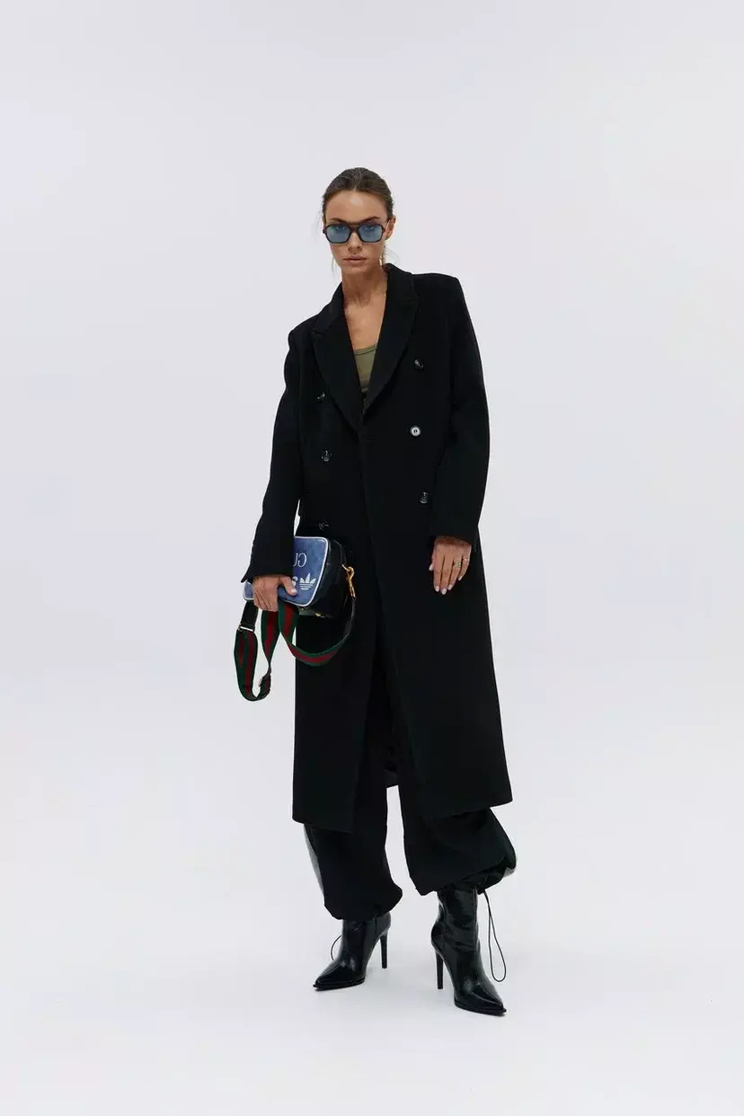 Двубортное пальто из плотной шерсти с чёткой вертикалью кроя. Аккуратные лацканы и строгая линия плеч подчеркивают графичность, а удлинённая форма вытягивает силуэт. Идеальный баланс структуры и мягкости ткани делает модель универсальной для образов в городе — от деловых до вечерних.