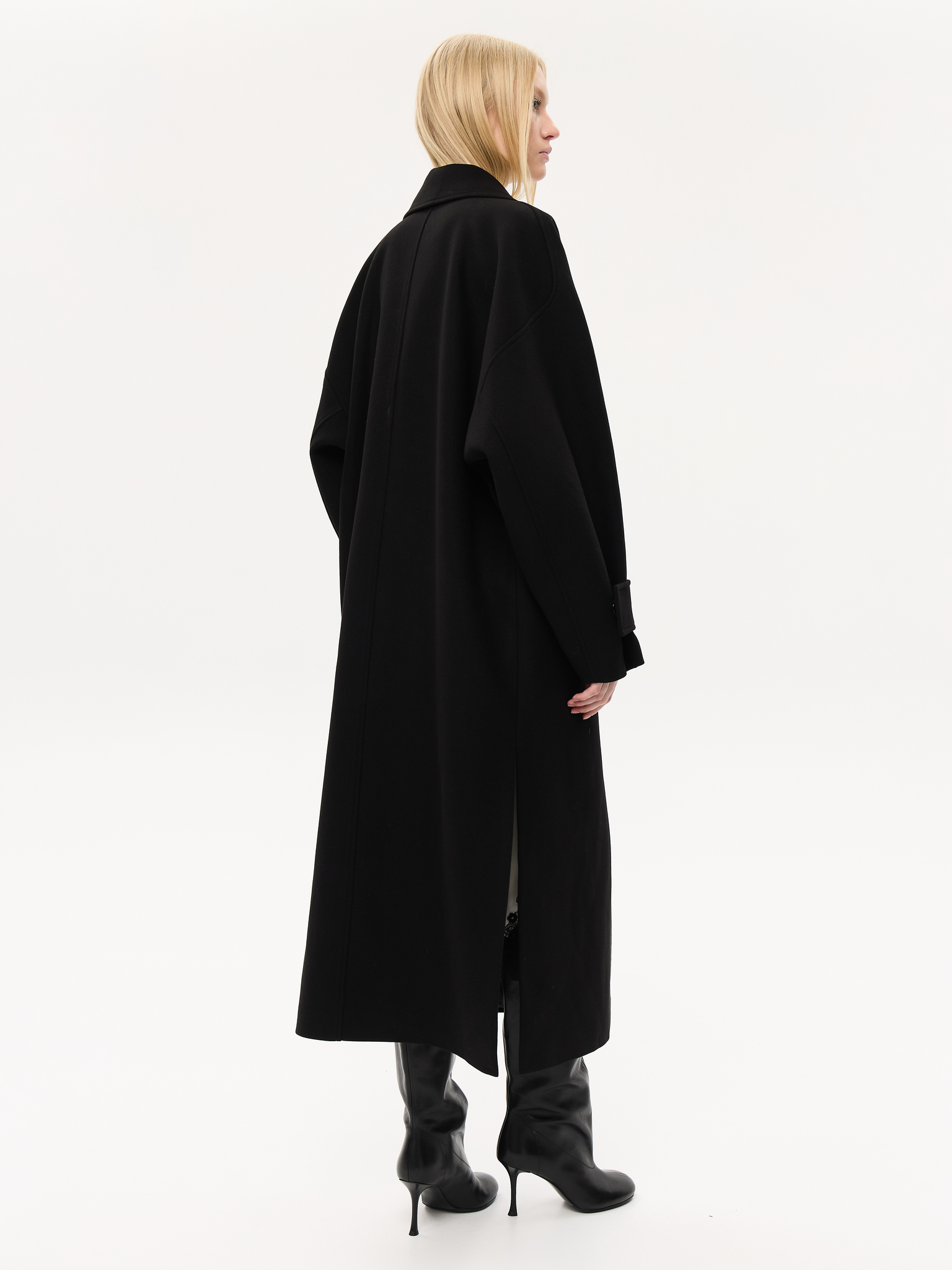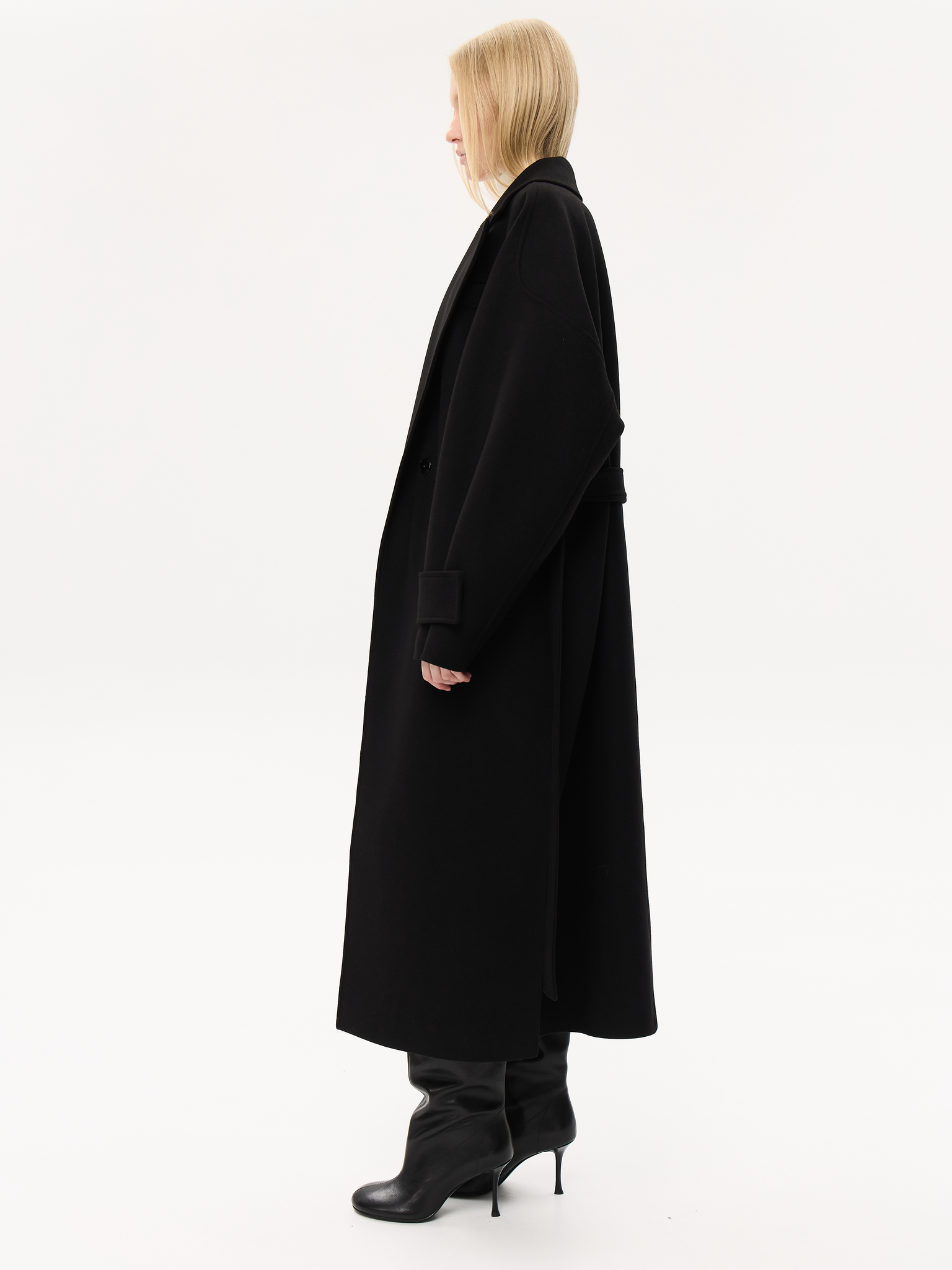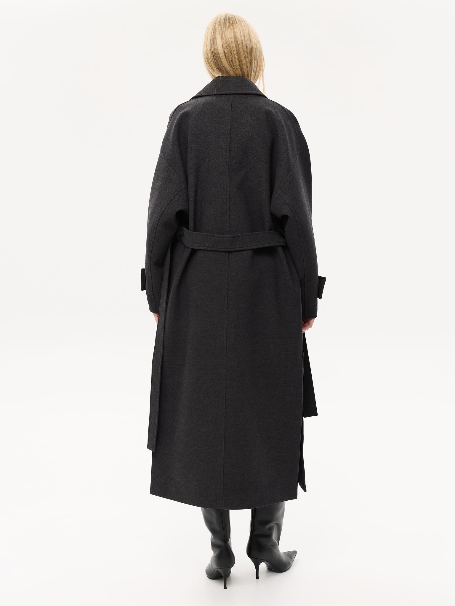 Пальто из чистой шерсти с удлинённым силуэтом, создающим ощущение скульптурности и лёгкой архитектурности. Широкие лацканы и мягкая линия плеч придают образу элегантную расслабленность, а аккуратный пояс фиксирует талию, сохраняя свободу движения. Глубокие карманы добавляют практичности, не нарушая лаконичность дизайна. Тщательно продуманная посадка и премиальное качество ткани делают модель универсальной — для городских прогулок, деловых встреч и особых вечеров.
