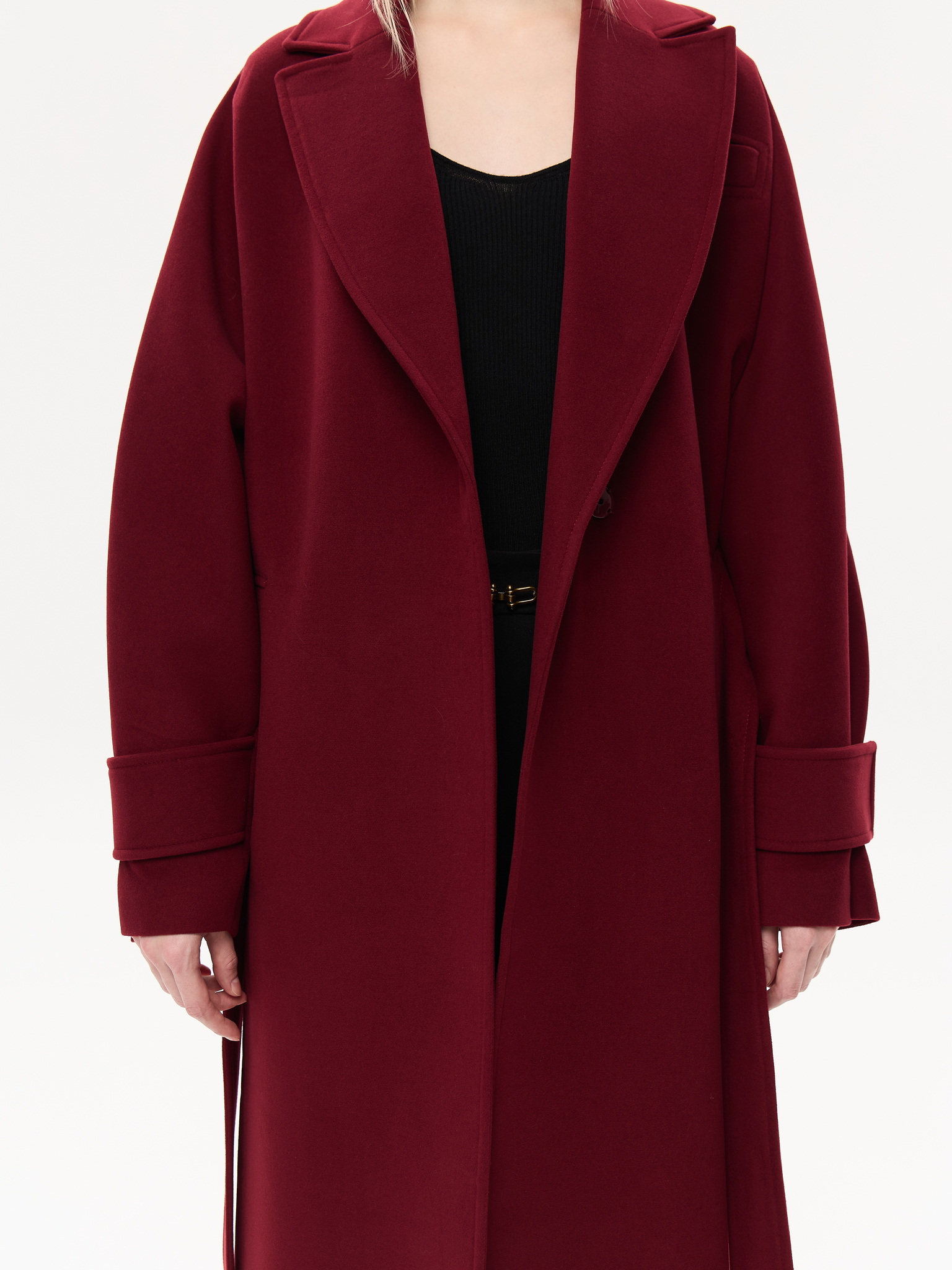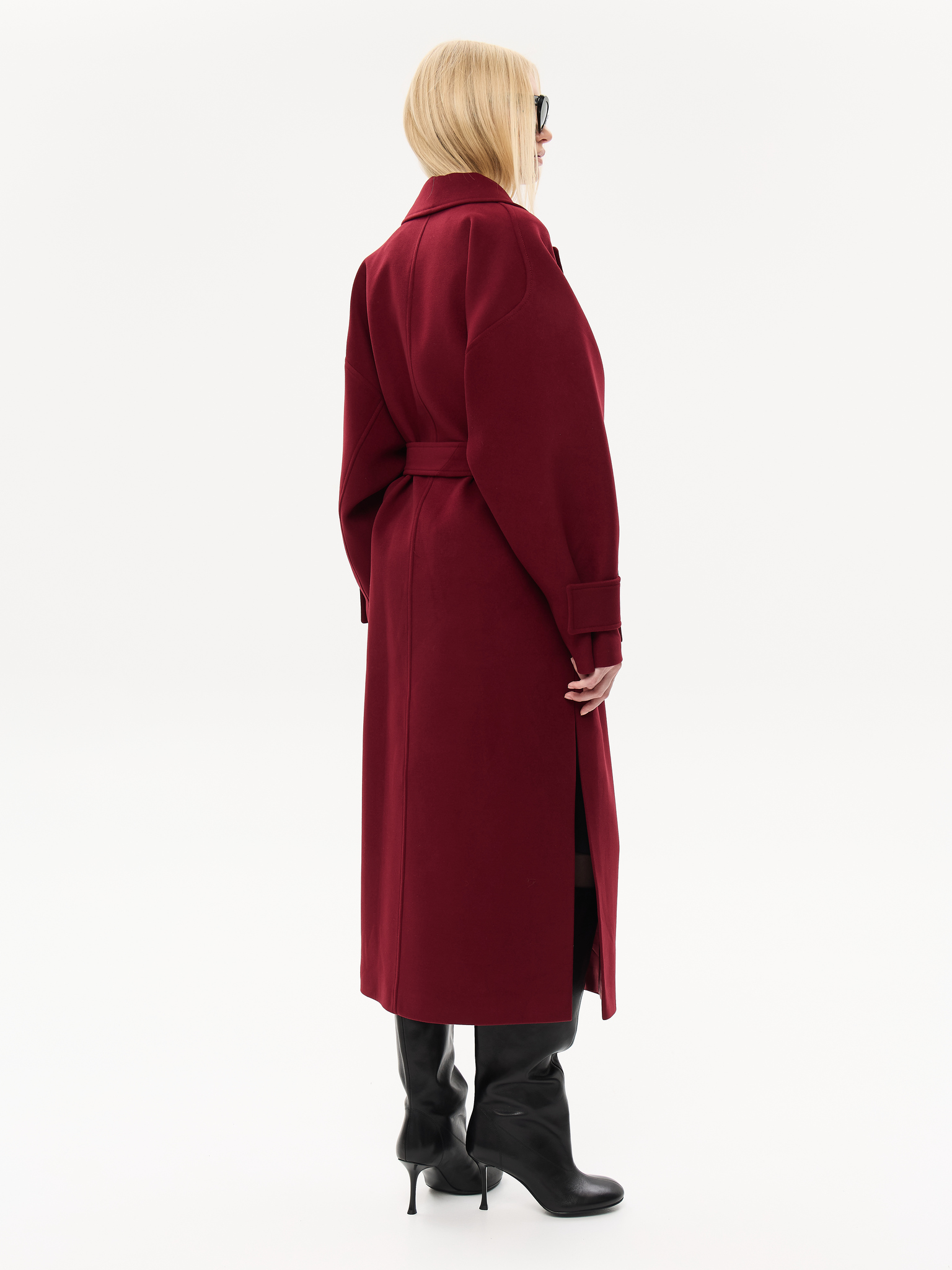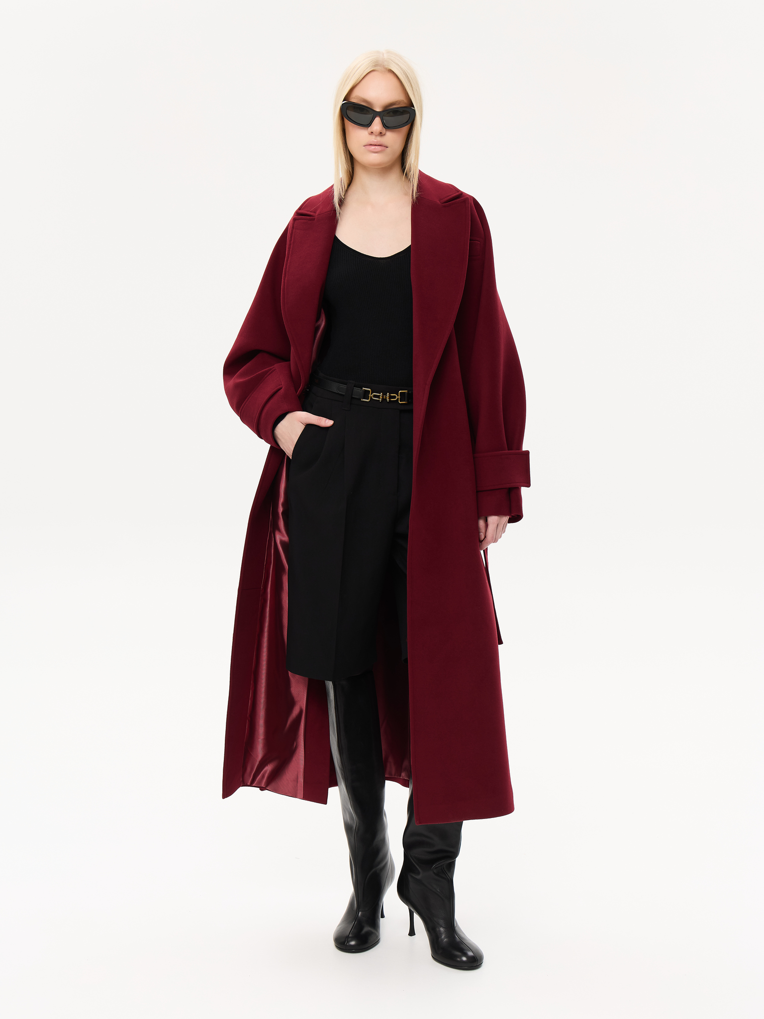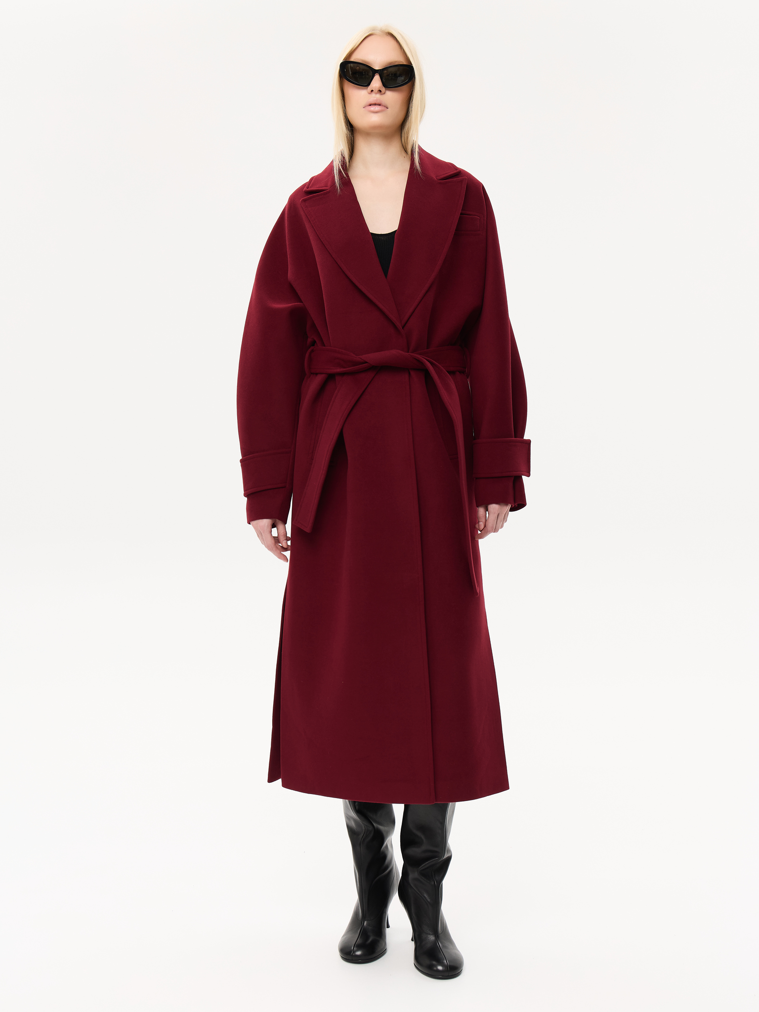 Пальто из чистой шерсти с удлинённым силуэтом, создающим ощущение скульптурности и лёгкой архитектурности. Широкие лацканы и мягкая линия плеч придают образу элегантную расслабленность, а аккуратный пояс фиксирует талию, сохраняя свободу движения. Глубокие карманы добавляют практичности, не нарушая лаконичность дизайна. Тщательно продуманная посадка и премиальное качество ткани делают модель универсальной — для городских прогулок, деловых встреч и особых вечеров.