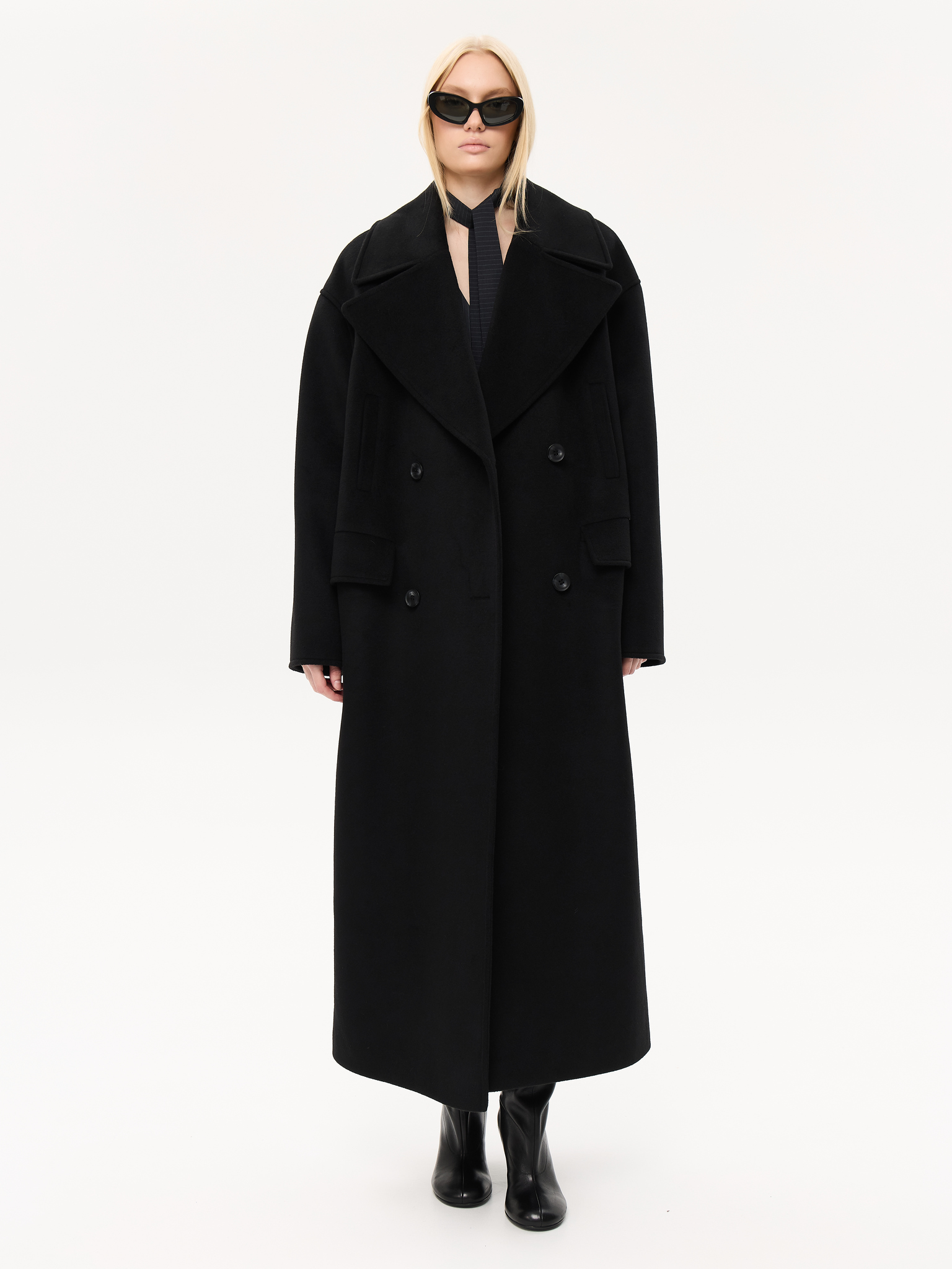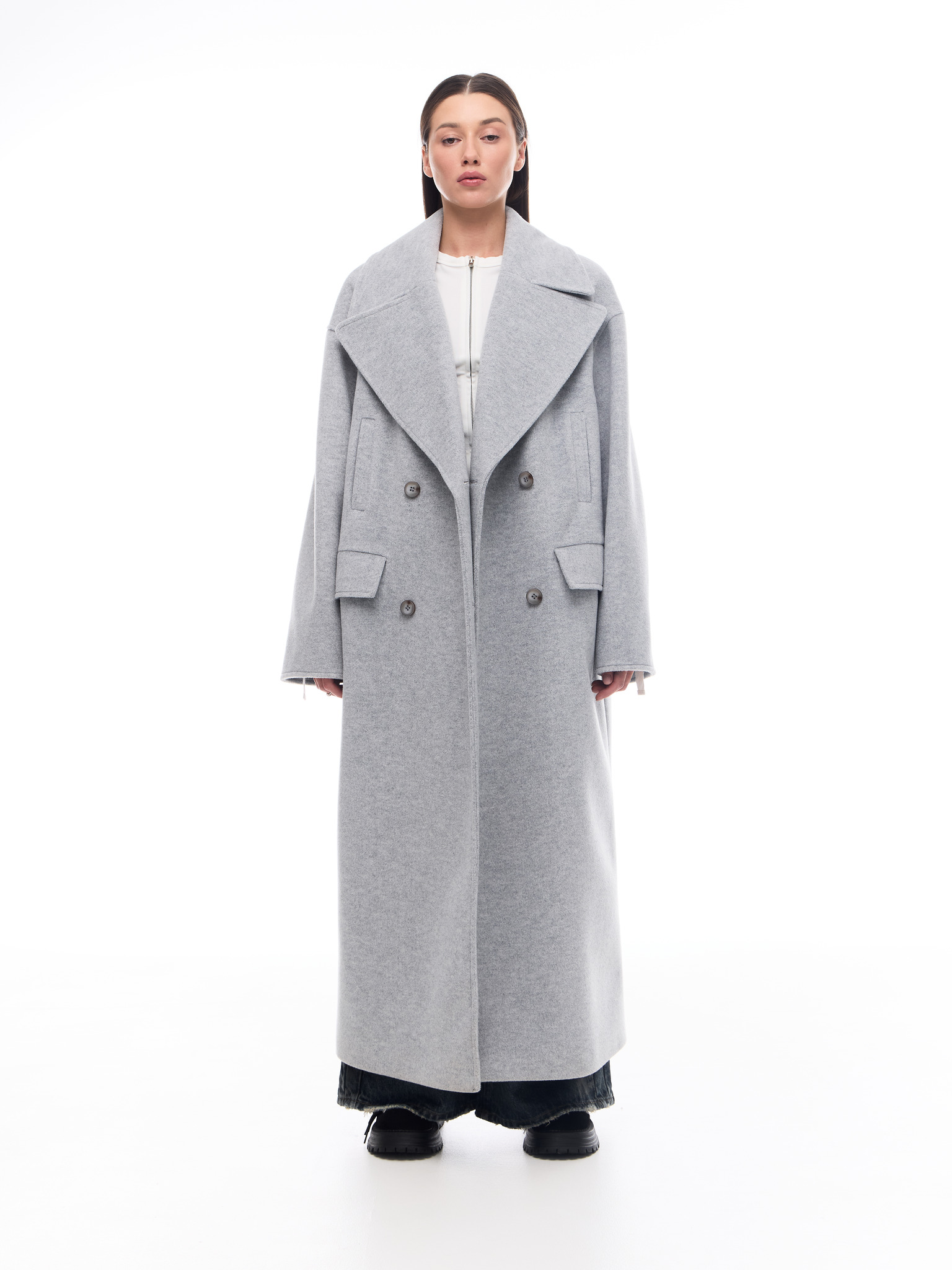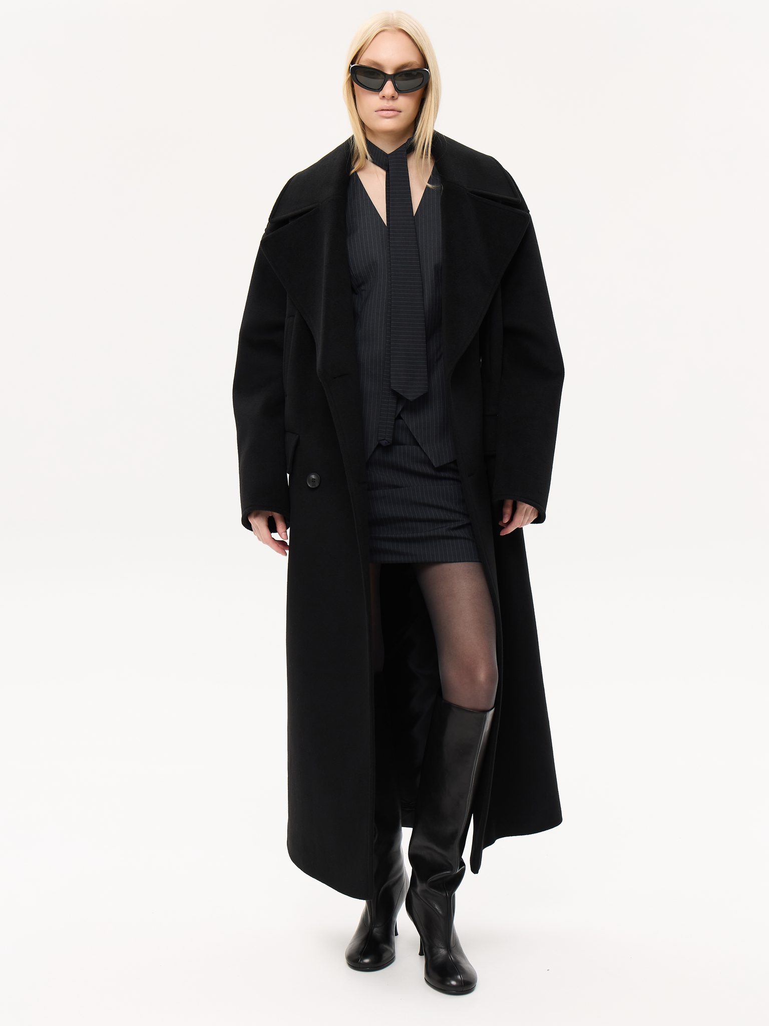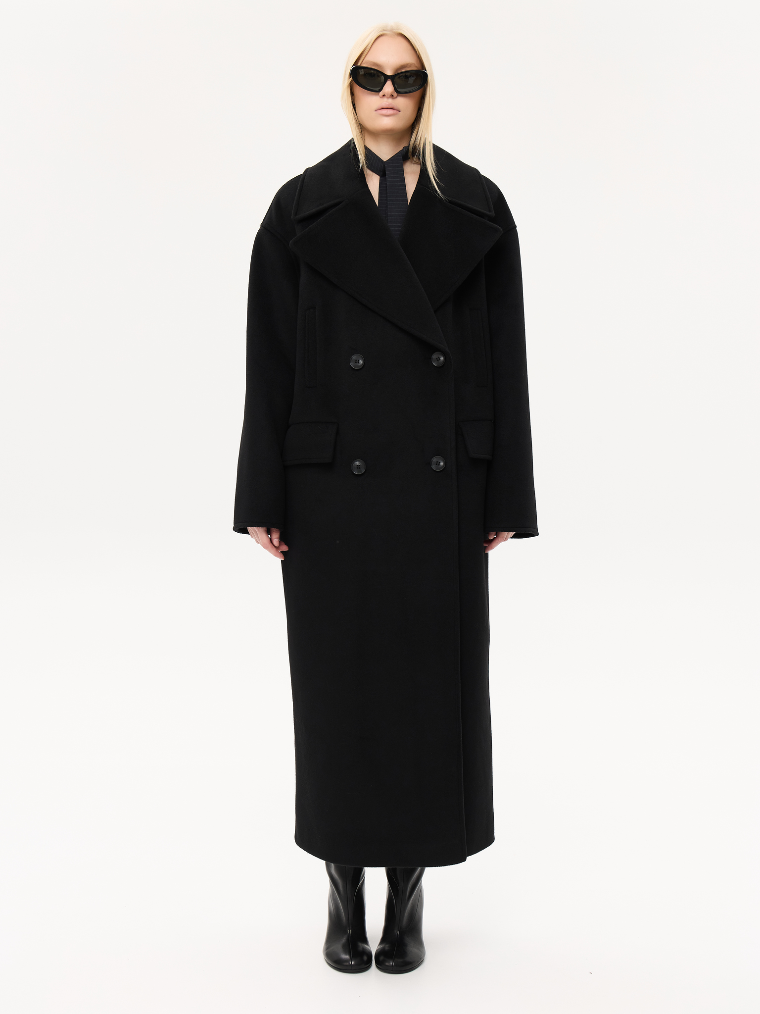 Пальто из натуральной шерсти в удлинённом крое с акцентом на объем и архитектурные линии. Широкий лацкан и двойная застёжка подчеркивают выразительность силуэта, а глубокие карманы добавляют функциональности. Чистота формы и благородная текстура ткани делают модель универсальной основой для современного гардероба в люксовом прочтении.