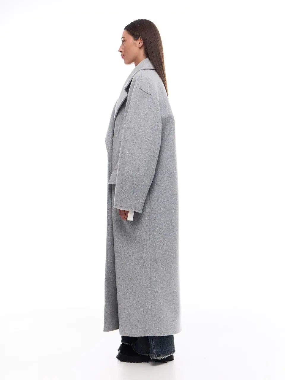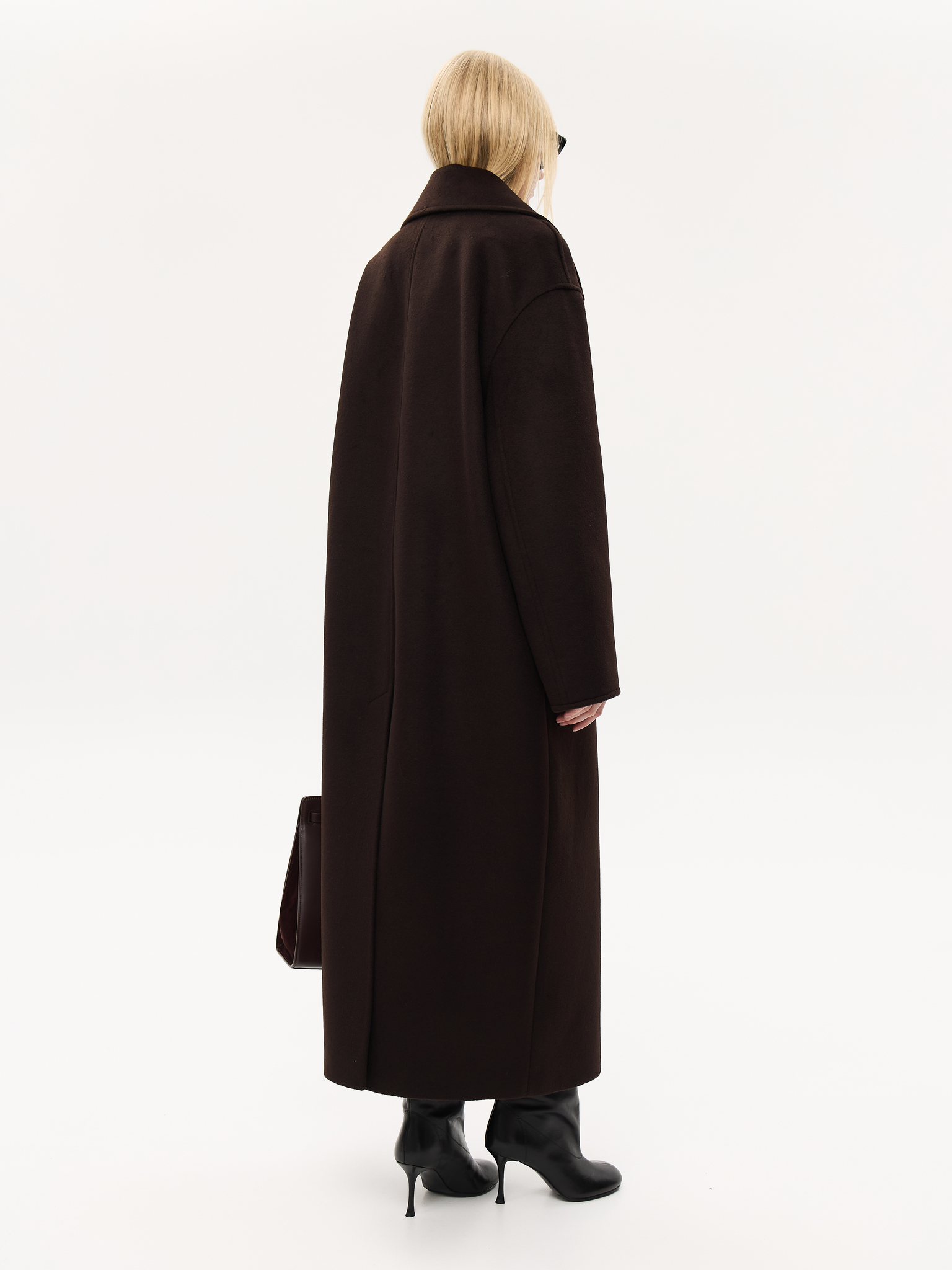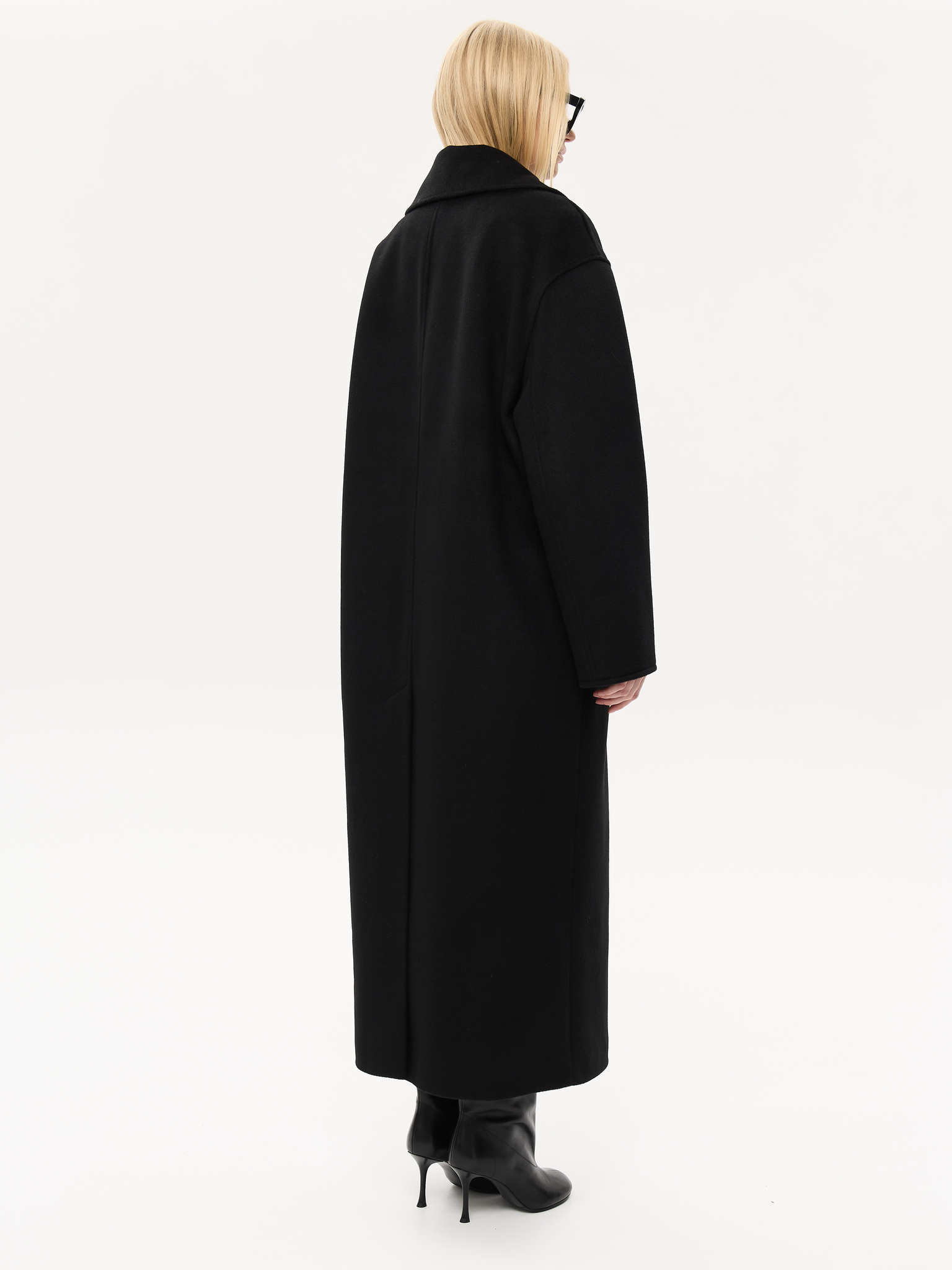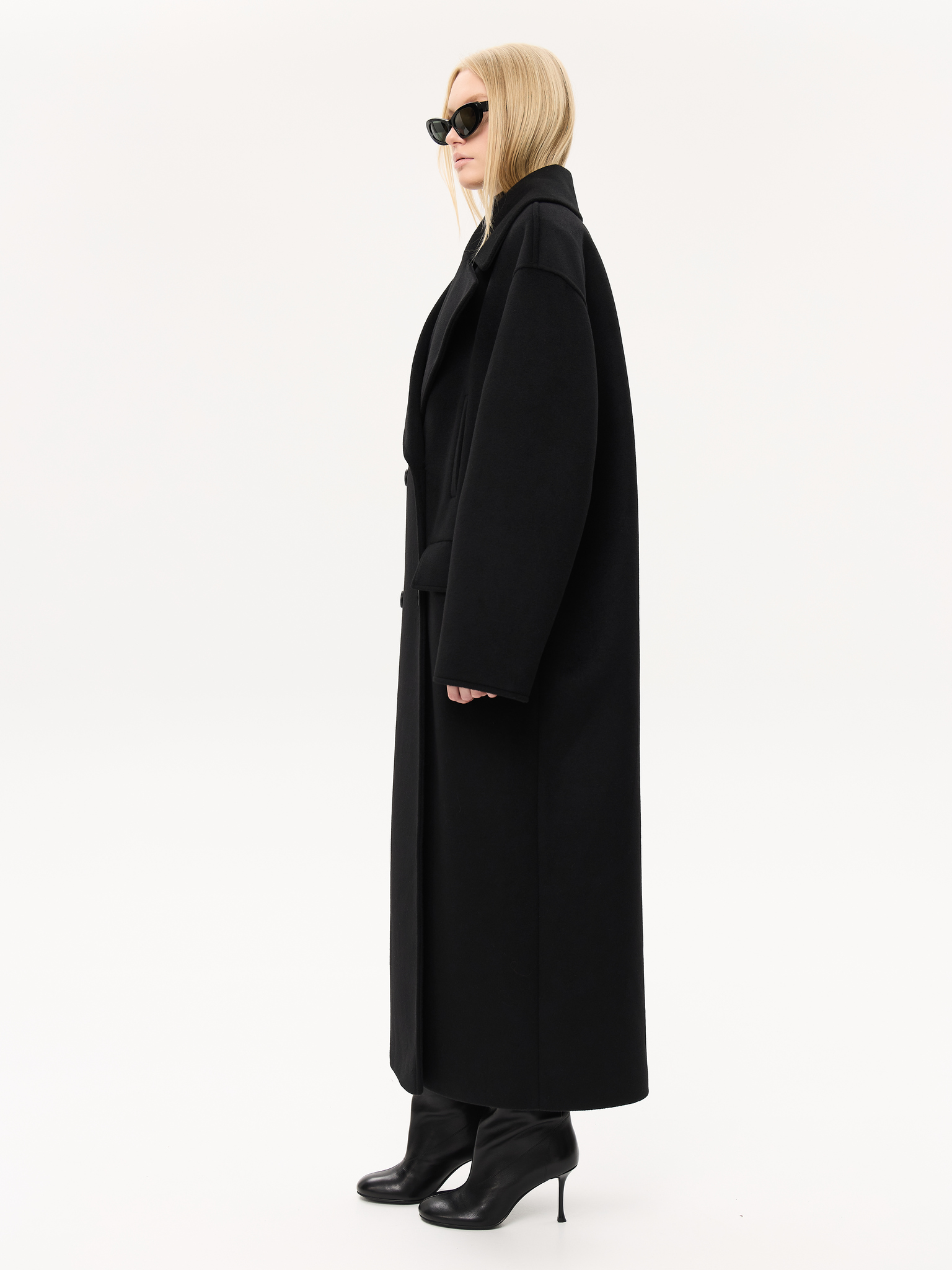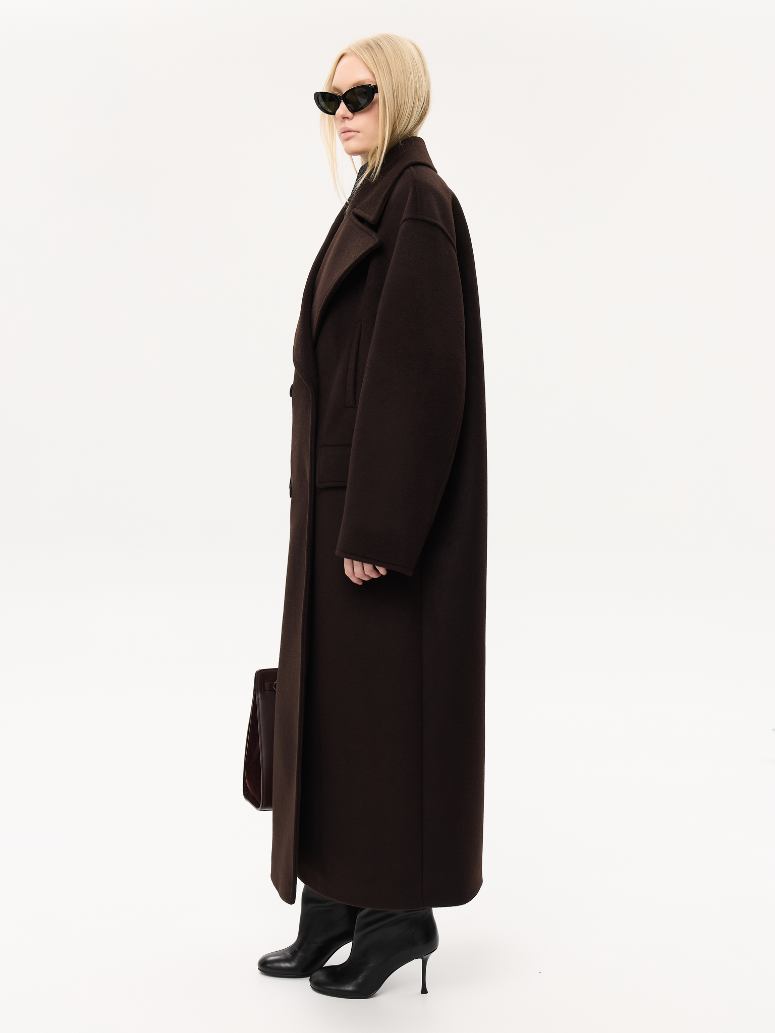 Пальто из натуральной шерсти в удлинённом крое с акцентом на объем и архитектурные линии. Широкий лацкан и двойная застёжка подчеркивают выразительность силуэта, а глубокие карманы добавляют функциональности. Чистота формы и благородная текстура ткани делают модель универсальной основой для современного гардероба в люксовом прочтении.