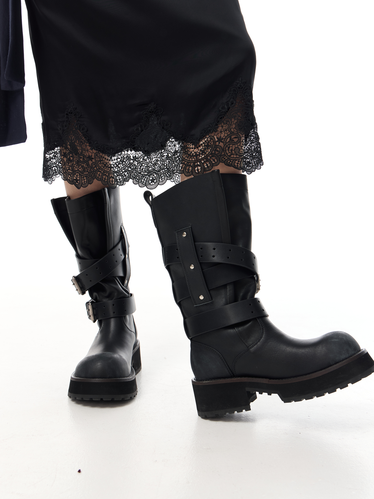 Высокие сапоги из натуральной кожи в стиле rebel. Жёсткий силуэт с акцентными ремнями и металлическими пряжками создаёт дерзкий образ. Устойчивый каблук и рельефная подошва добавляют удобства и брутальности.