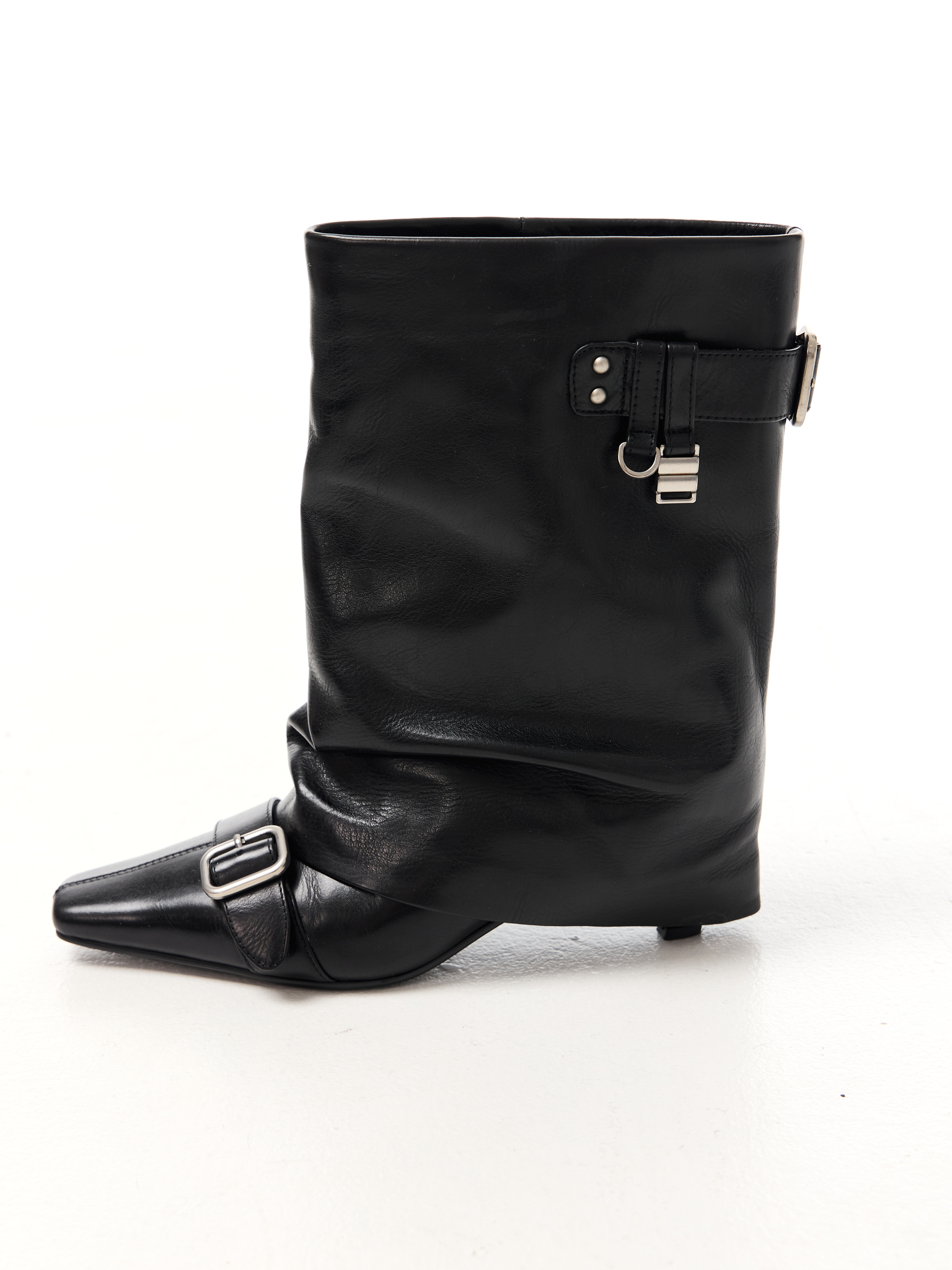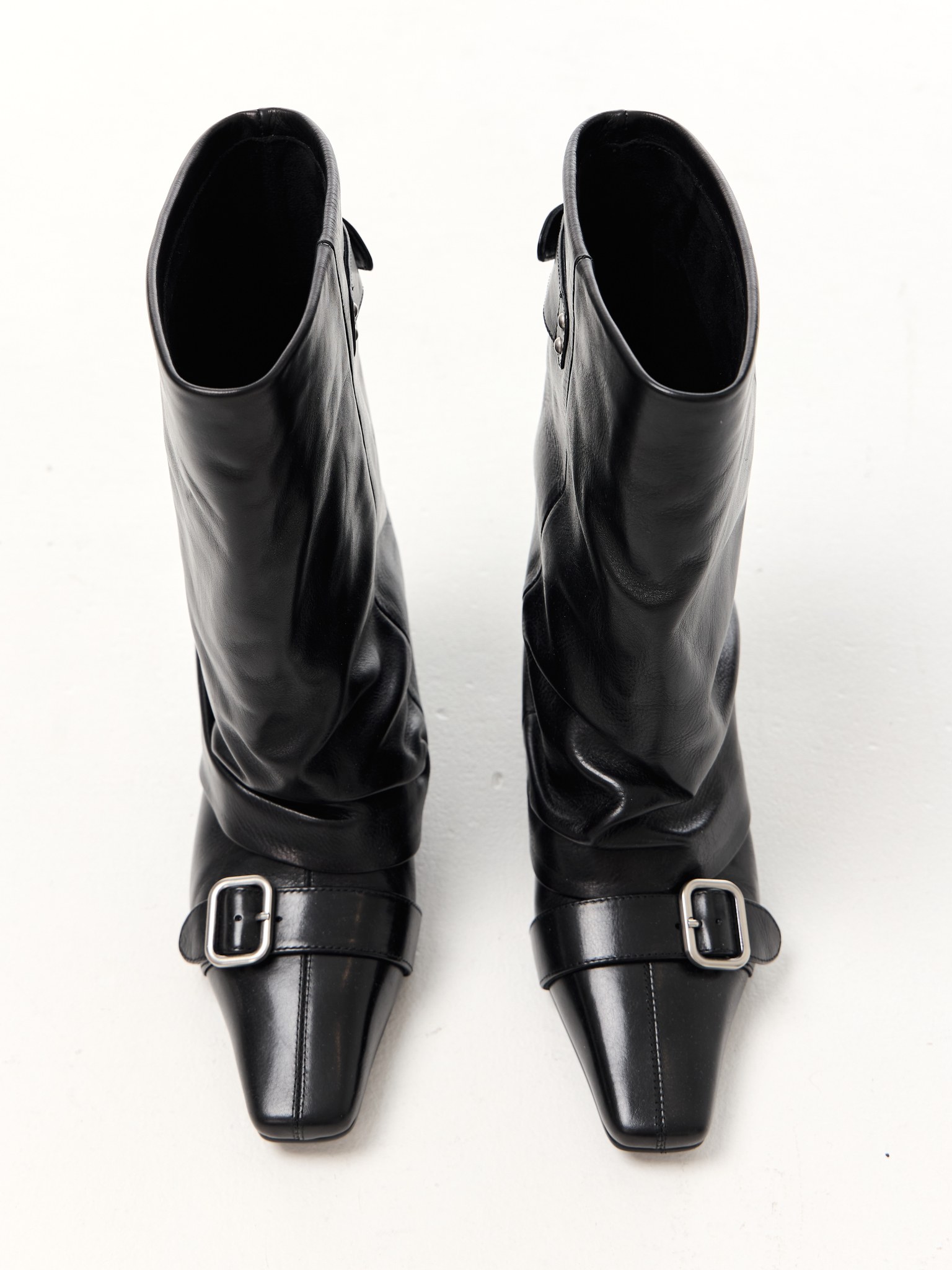Черные сапоги из мягкой кожи с характерным байкерским настроением. Свободная голень создает эффект драпировки, а металлические пряжки спереди и сбоку подчеркивают дерзкий характер модели. Квадратный мыс добавляет современности, делая обувь выразительным акцентом в образе.