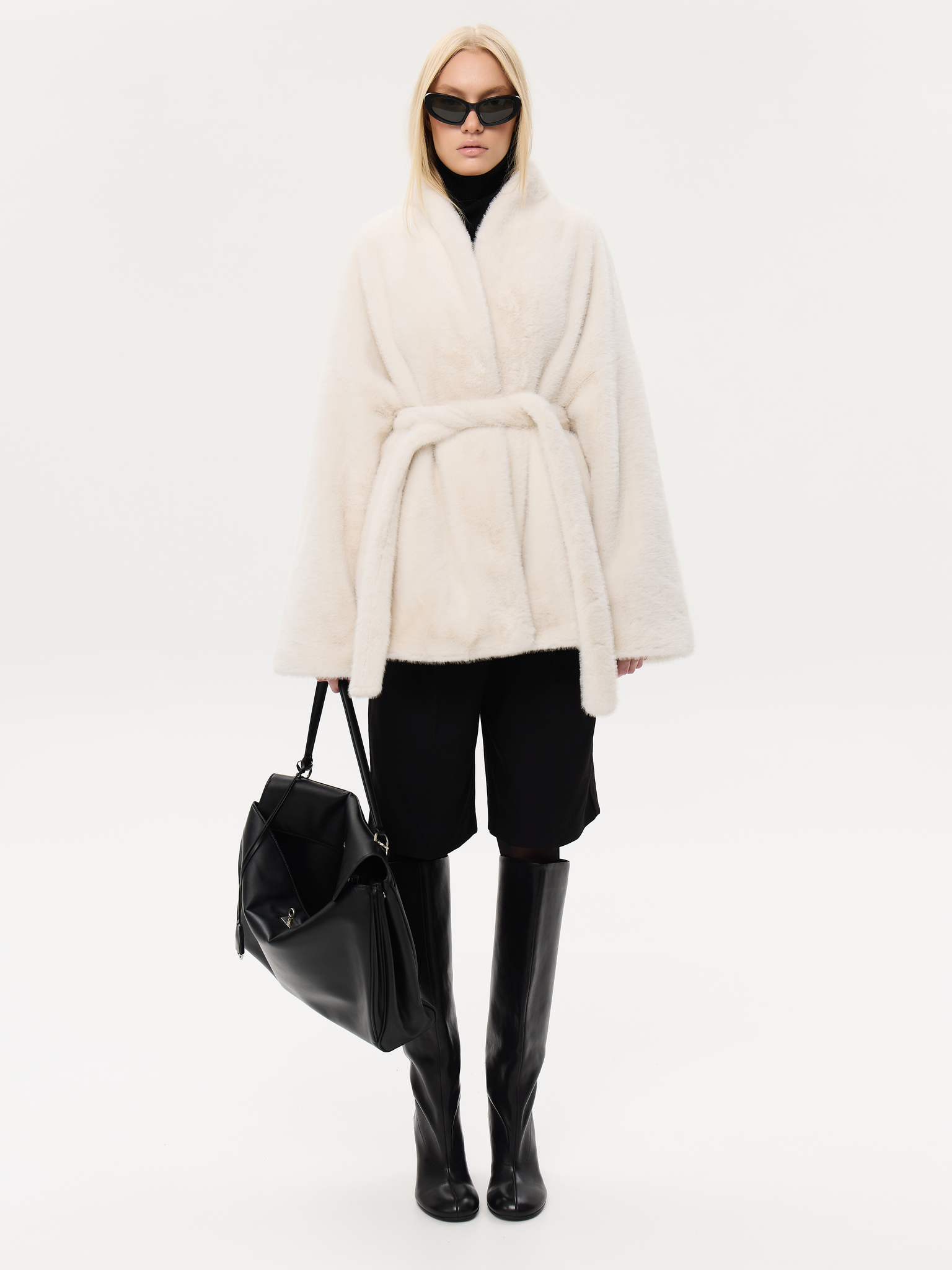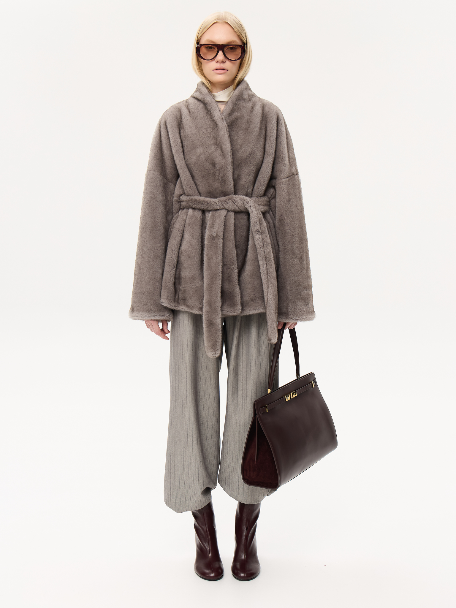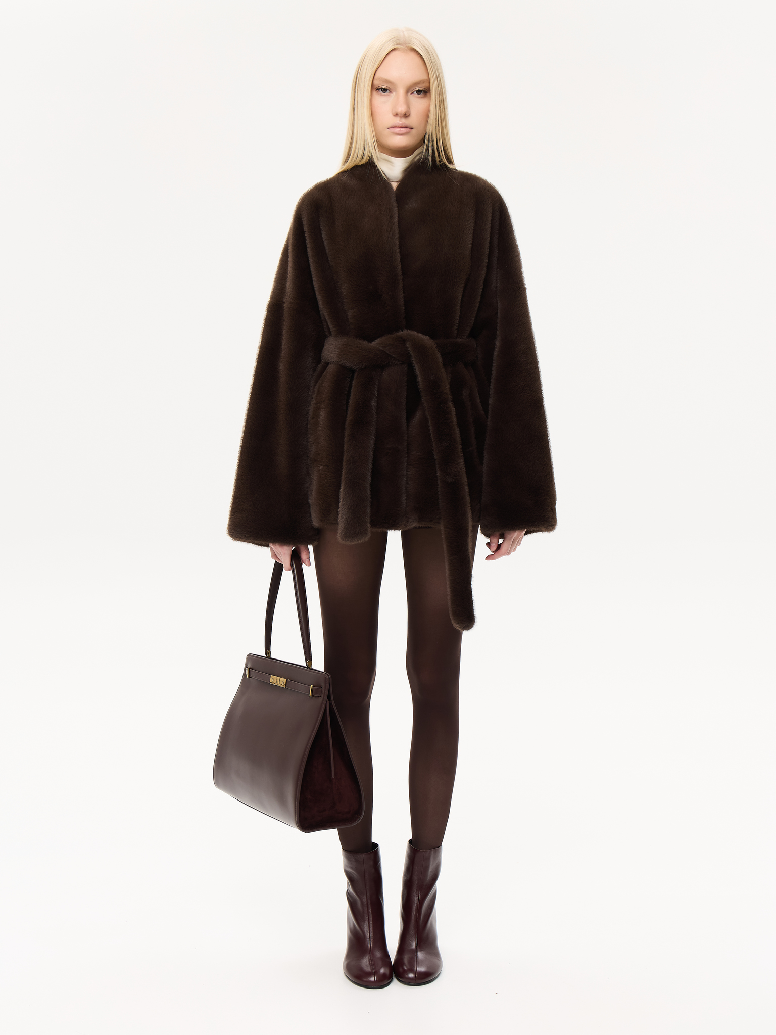 Объёмный силуэт с мягкой линией плеч и широкими рукавами создаёт ощущение лёгкости и уюта. Пояс позволяет трансформировать посадку, подчеркивая талию. Минималистичный дизайн со скрытой застёжкой делает модель универсальной и современно элегантной.