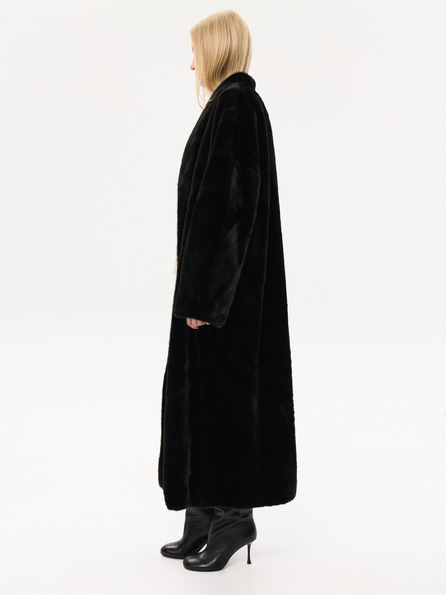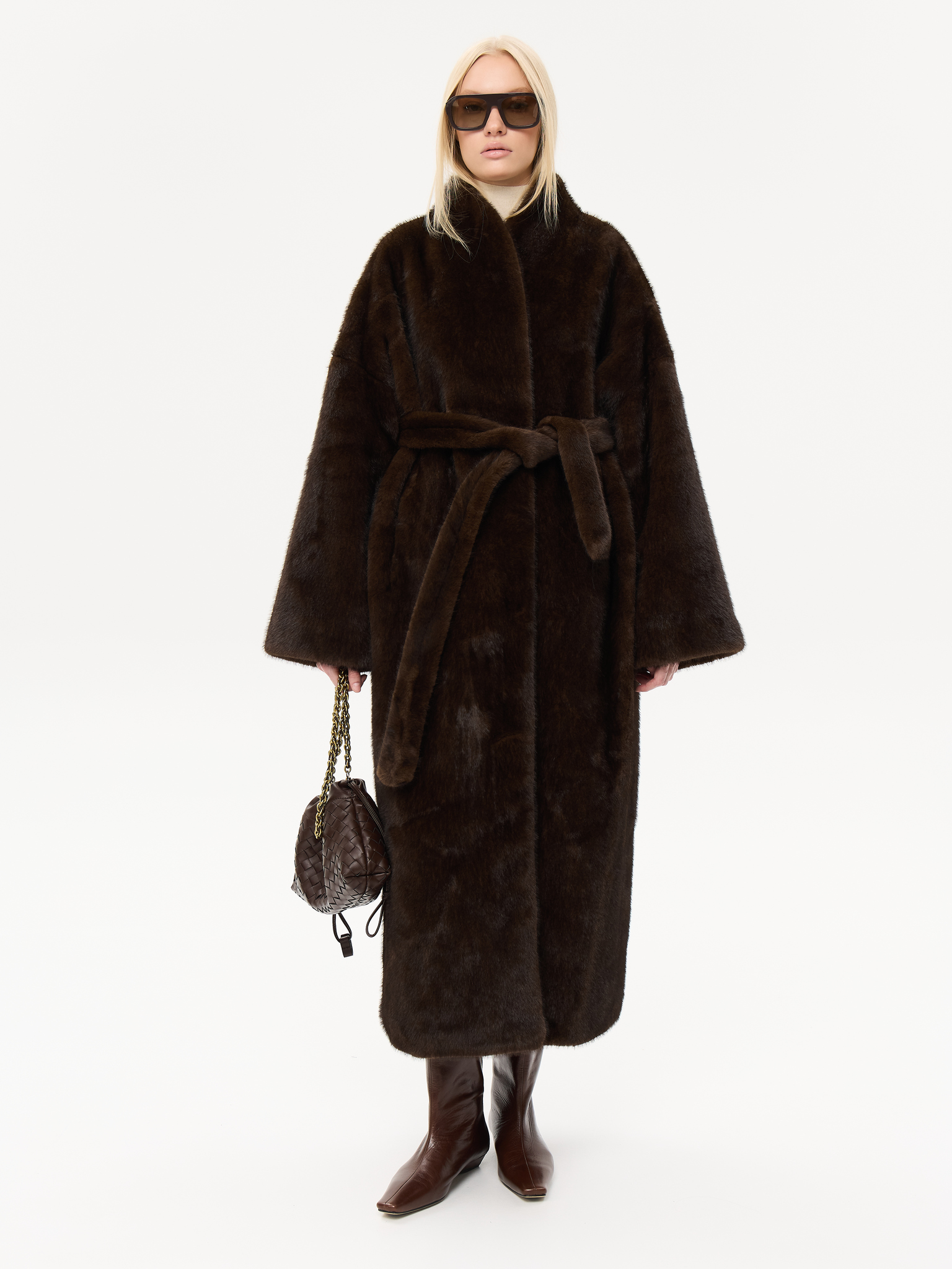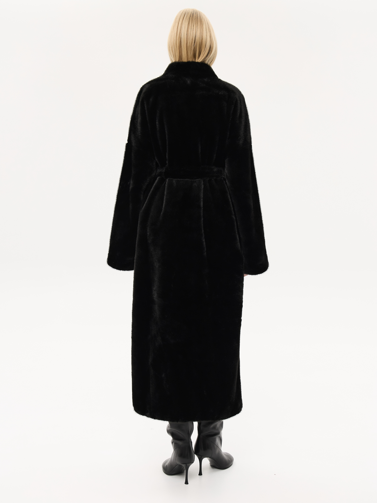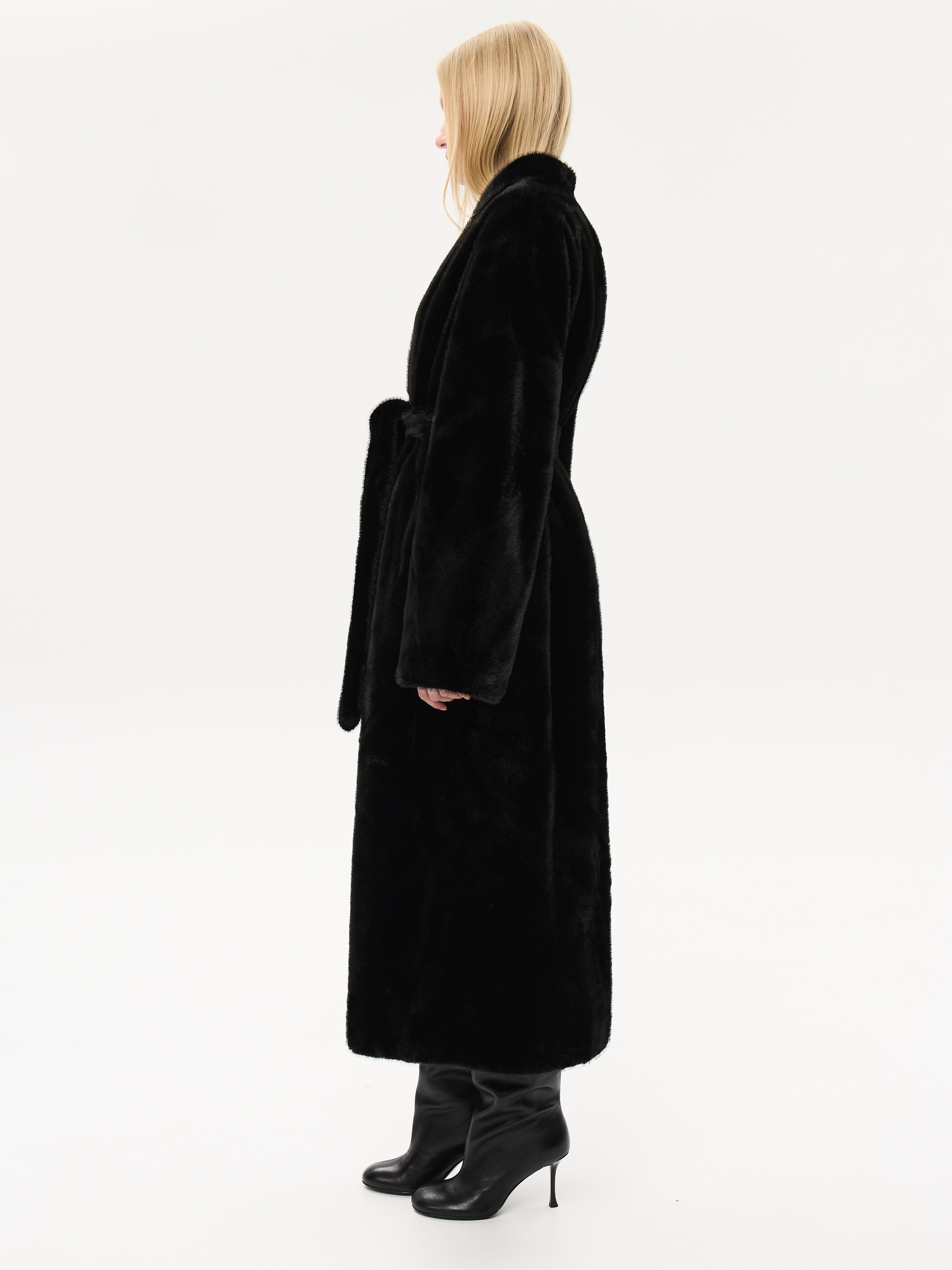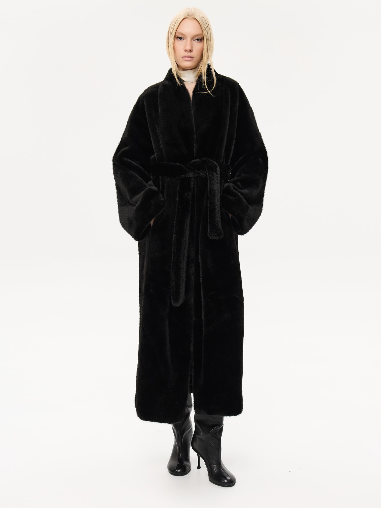 Длинная шуба прямого силуэта с запахом и мягким поясом, который позволяет подчеркнуть талию или оставить образ расслабленным. Минималистичный крой и высокая стойка воротника придают шубе архитектурную чёткость, сохраняя при этом ощущение мягкости и комфорта. Чистые линии, удлинённые рукава и глубокие карманы создают гармонию практичности и стиля. Универсальная модель, которая легко сочетается как с лаконичными костюмами, так и с вечерними образами, подчеркивая статус и вкус.