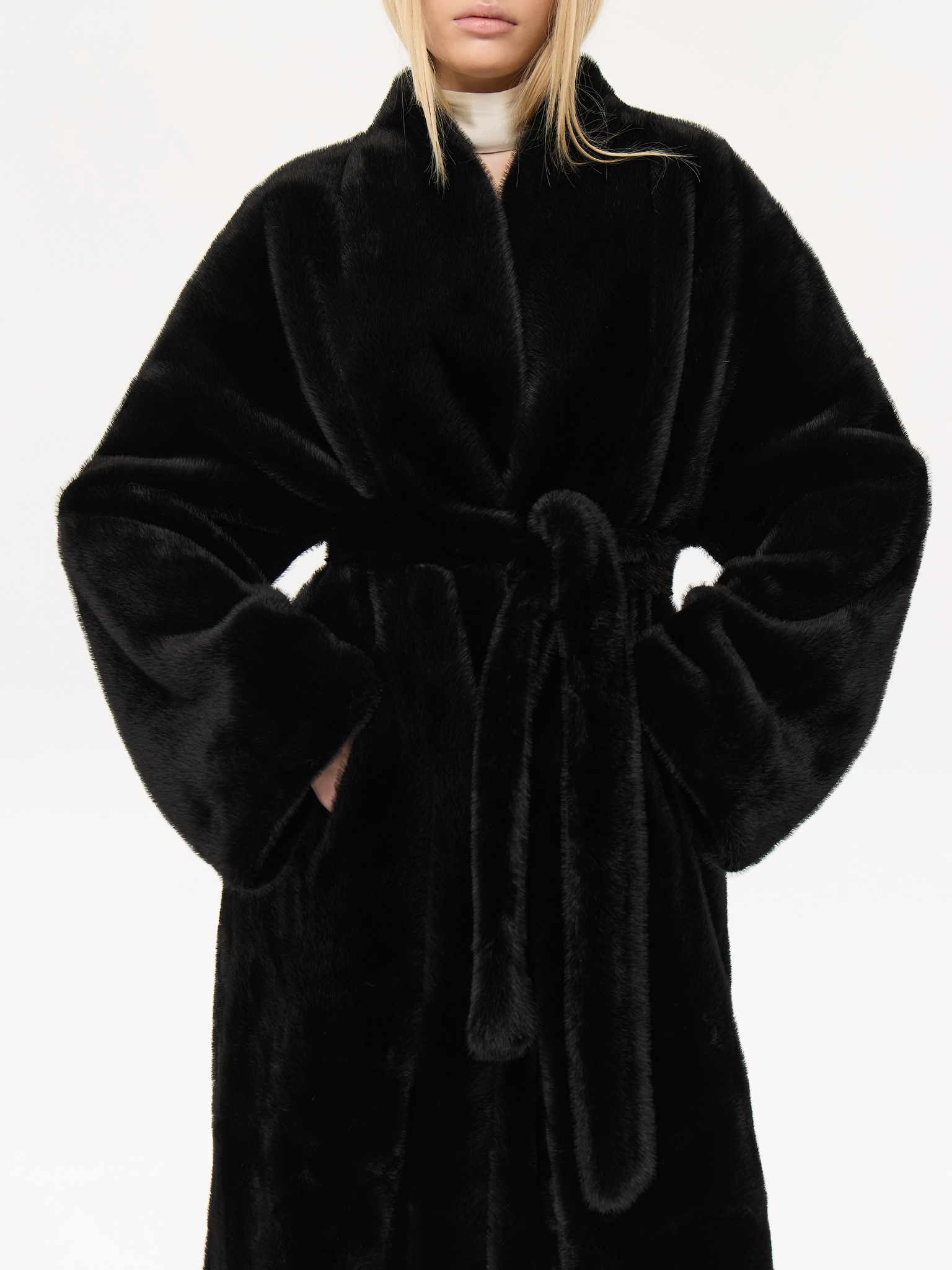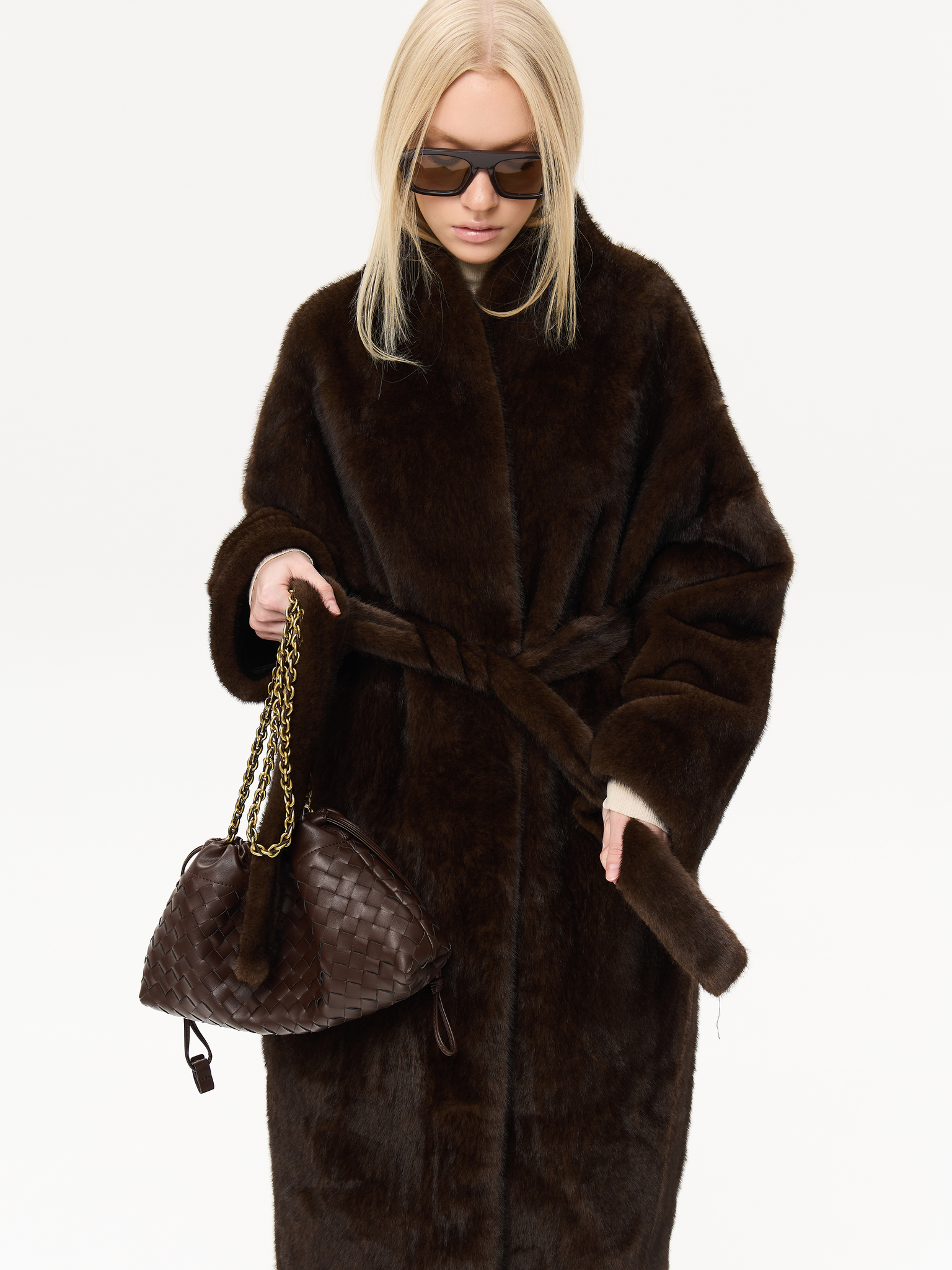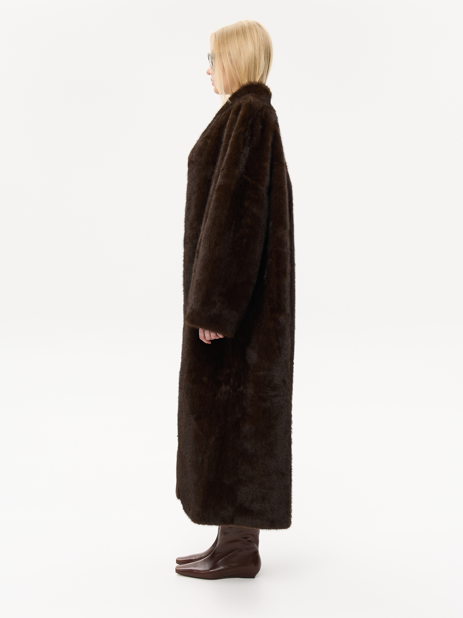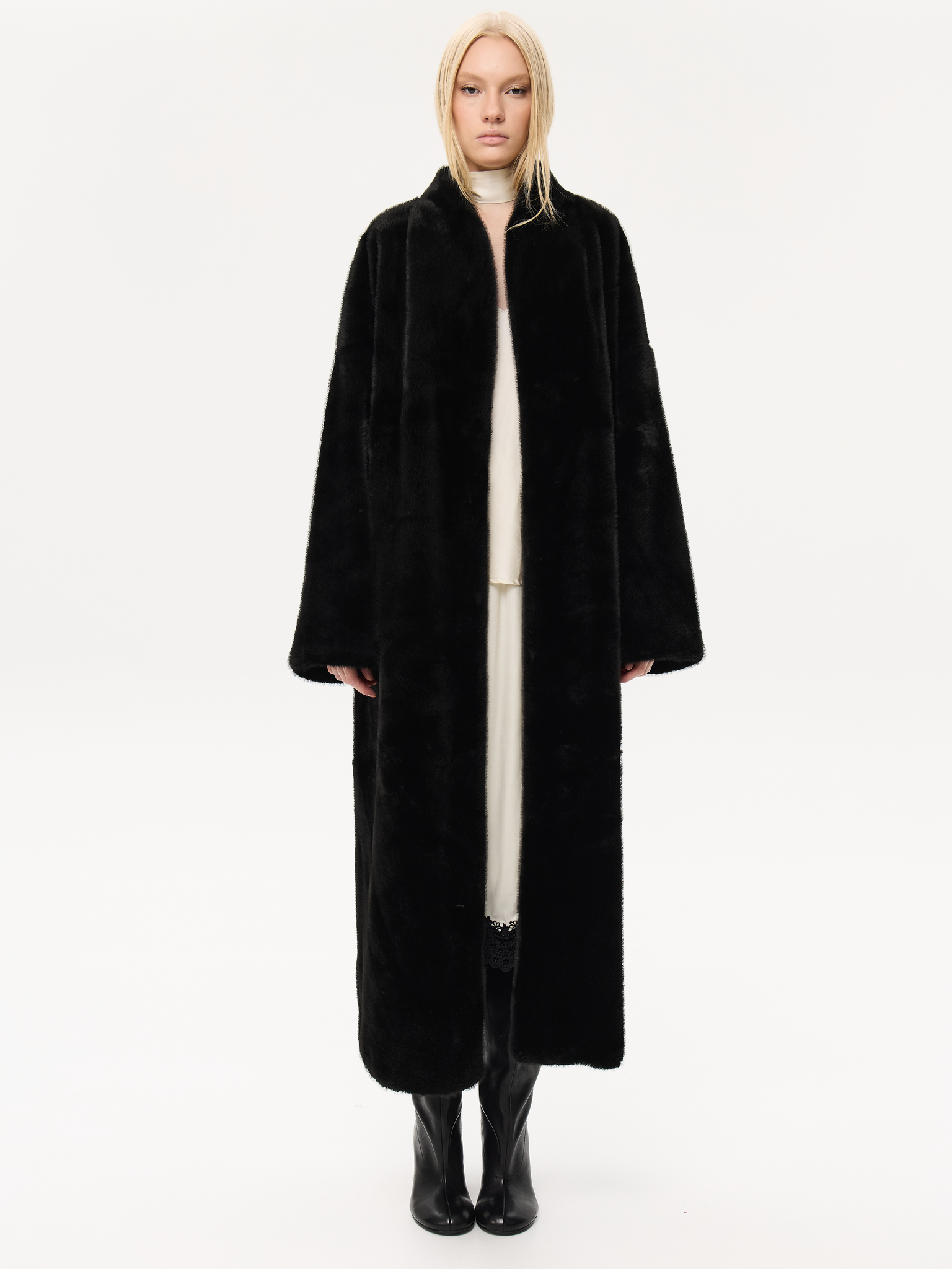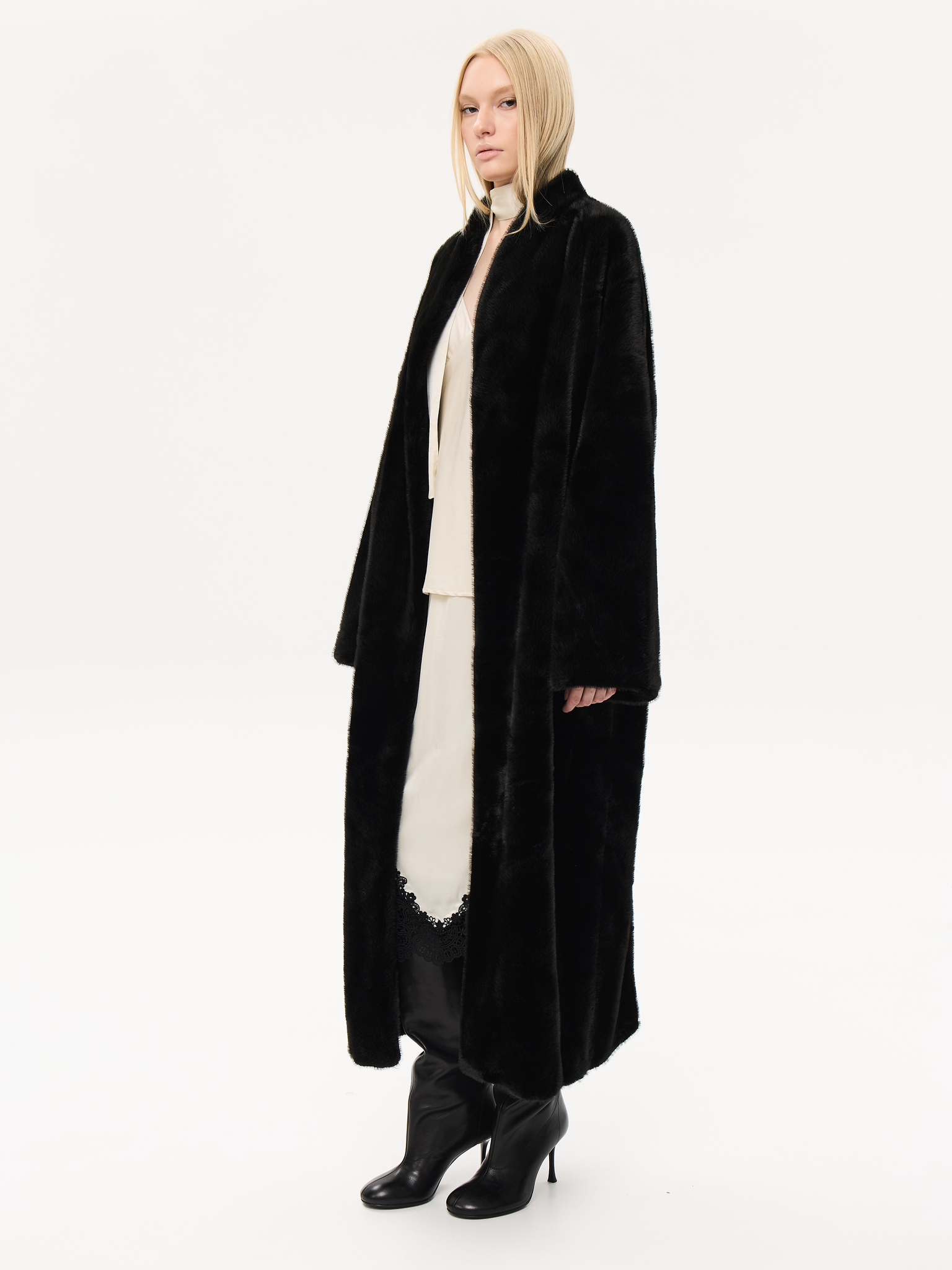 Длинная шуба прямого силуэта с запахом и мягким поясом, который позволяет подчеркнуть талию или оставить образ расслабленным. Минималистичный крой и высокая стойка воротника придают шубе архитектурную чёткость, сохраняя при этом ощущение мягкости и комфорта. Чистые линии, удлинённые рукава и глубокие карманы создают гармонию практичности и стиля. Универсальная модель, которая легко сочетается как с лаконичными костюмами, так и с вечерними образами, подчеркивая статус и вкус.
