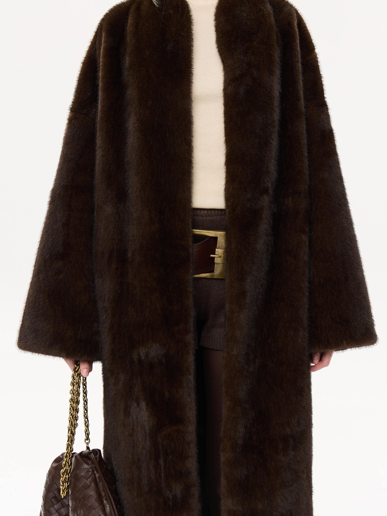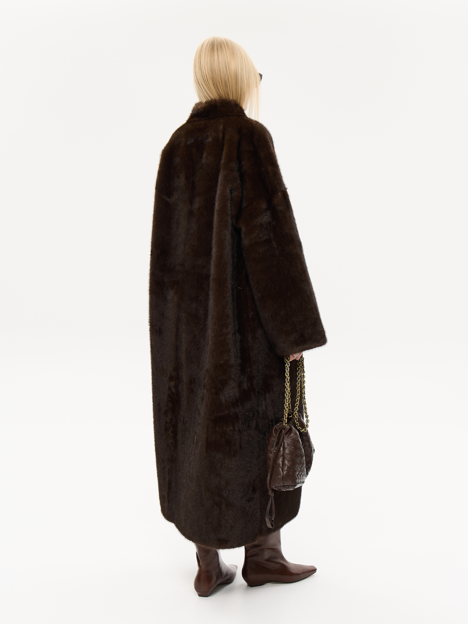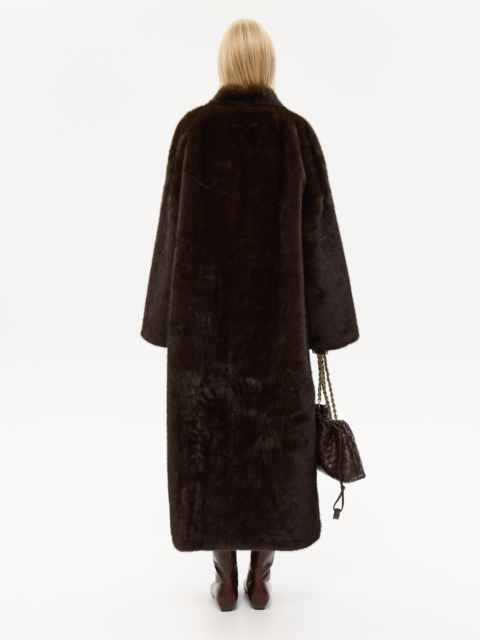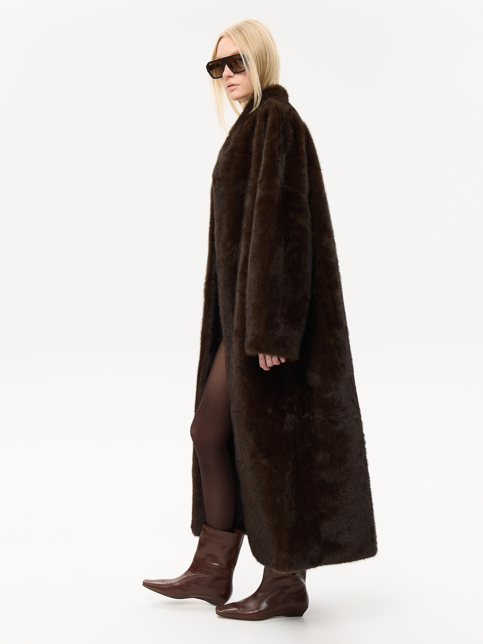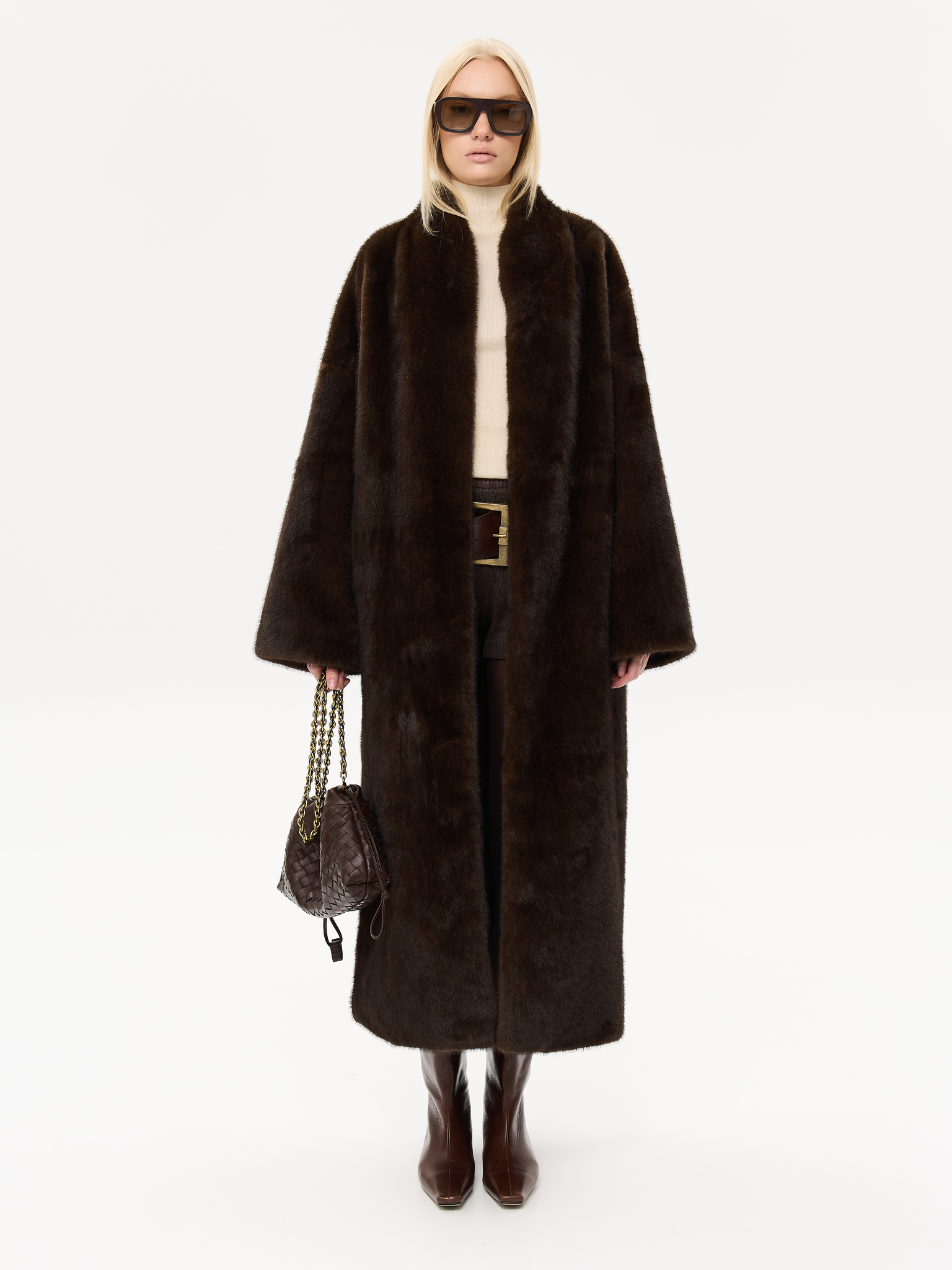 Длинная шуба прямого силуэта с запахом и мягким поясом, который позволяет подчеркнуть талию или оставить образ расслабленным. Минималистичный крой и высокая стойка воротника придают шубе архитектурную чёткость, сохраняя при этом ощущение мягкости и комфорта. Чистые линии, удлинённые рукава и глубокие карманы создают гармонию практичности и стиля. Универсальная модель, которая легко сочетается как с лаконичными костюмами, так и с вечерними образами, подчеркивая статус и вкус.