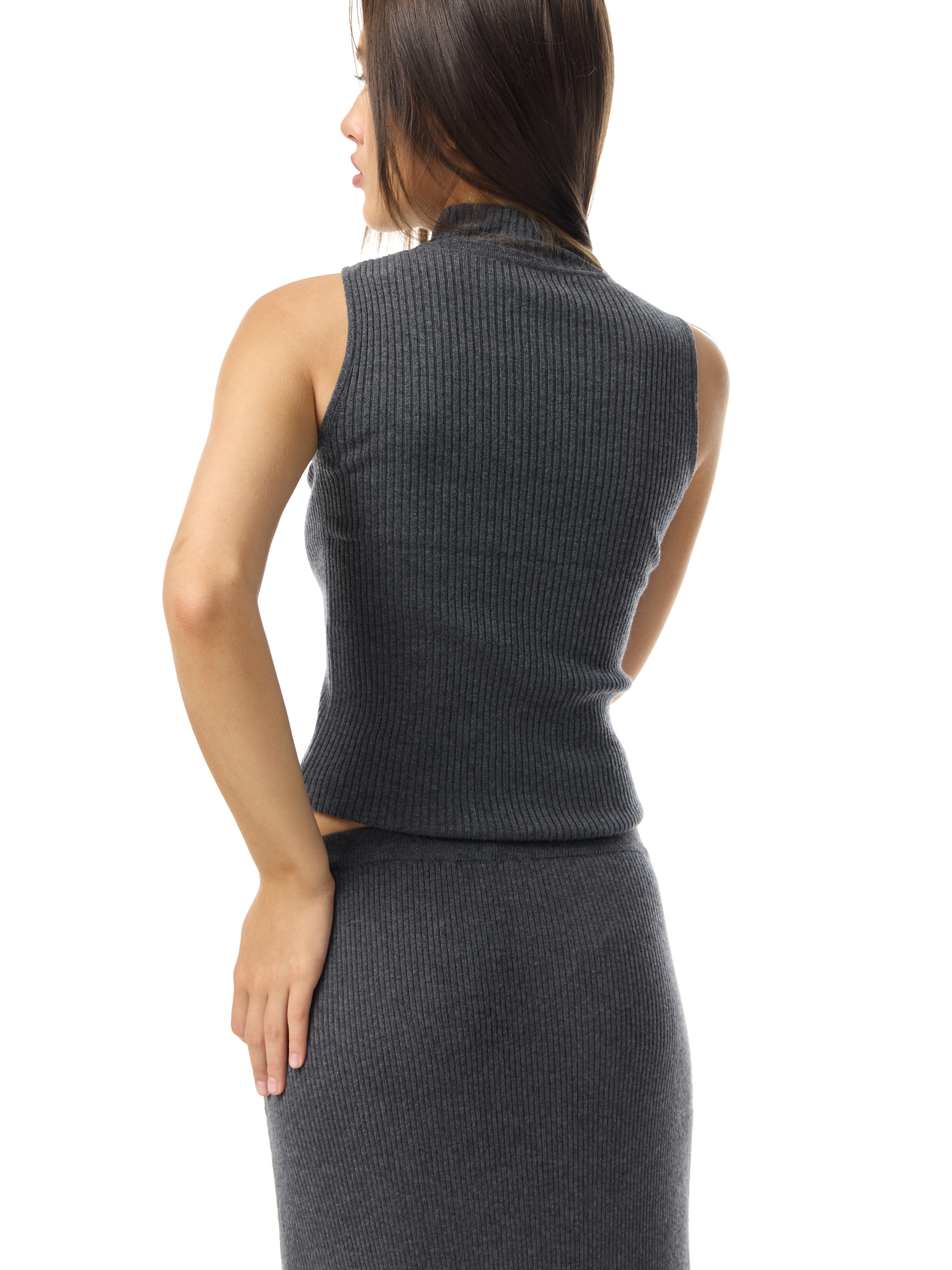Базовый трикотажный топ без рукавов из плотного рубчика. Прямой силуэт, лаконичный крой и мягкая посадка подчёркивают линию плеч и талию. Высокий ворот обеспечивает современный минималистичный акцент. Лаконичный верх, который легко сочетается с юбкой из комплекта или брюками в повседневных и вечерних образах.