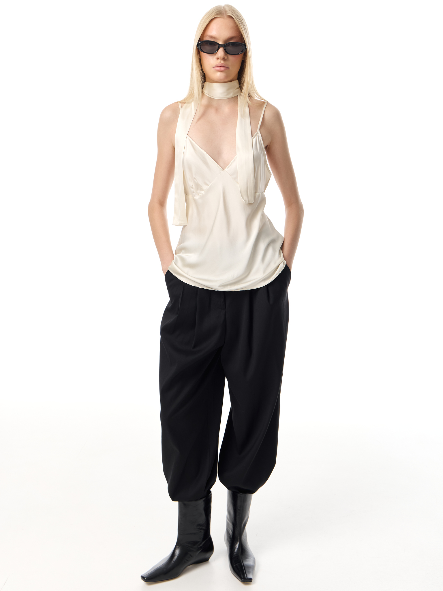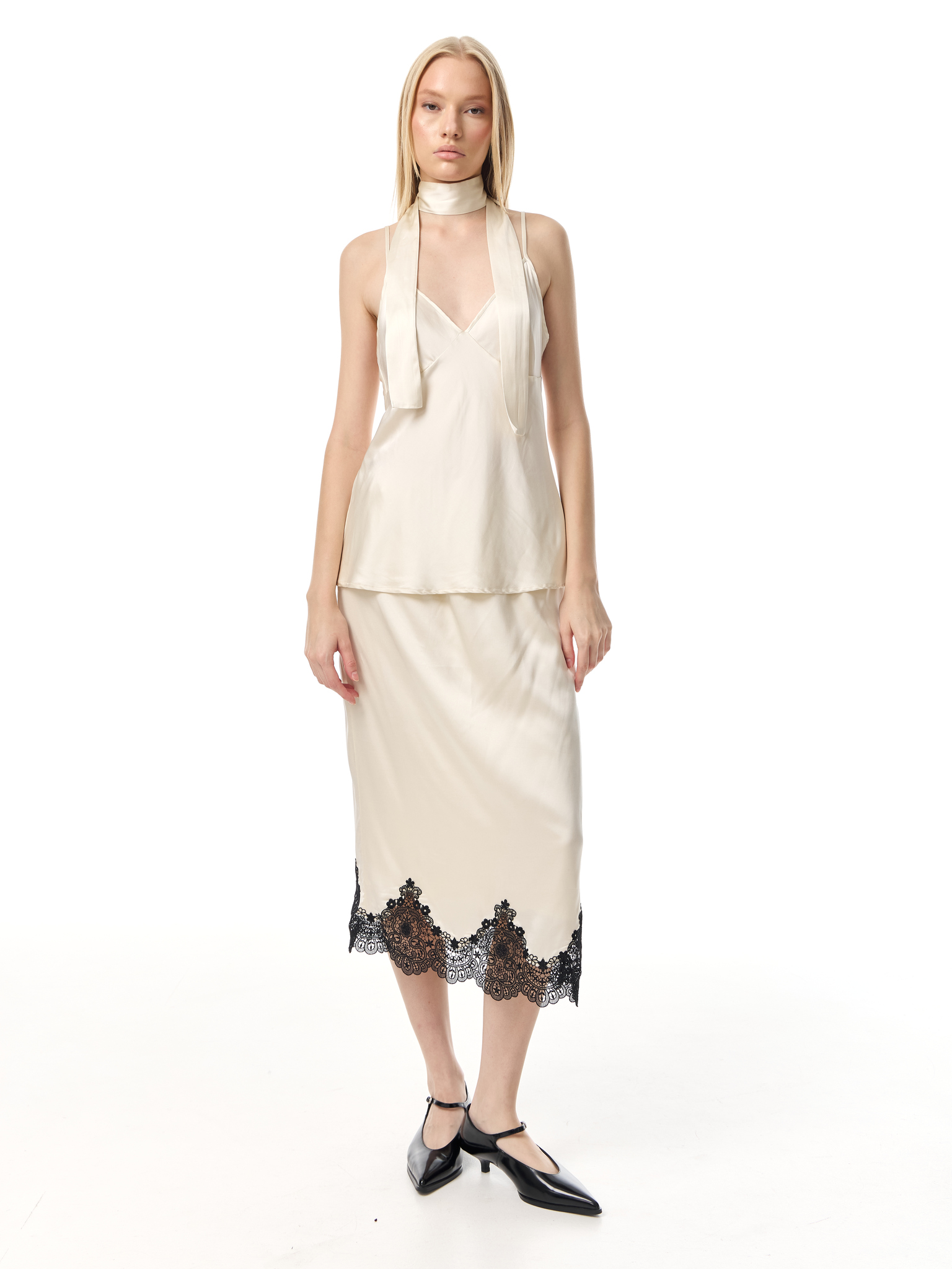 Шёлковый топ на тонких бретелях с глубоким V-образным вырезом. В комплекте длинная лента, которую можно завязать на шее или использовать как аксессуар. Лаконичный крой и лёгкая драпировка подчёркивают женственность, создавая элегантный и современный образ.