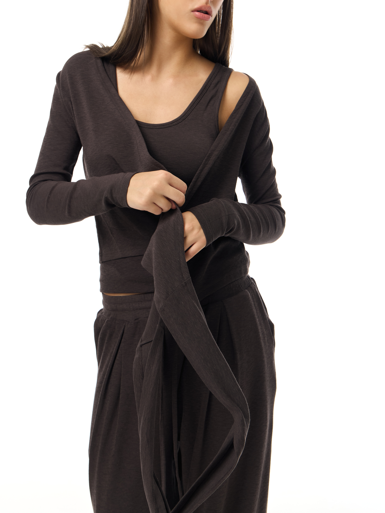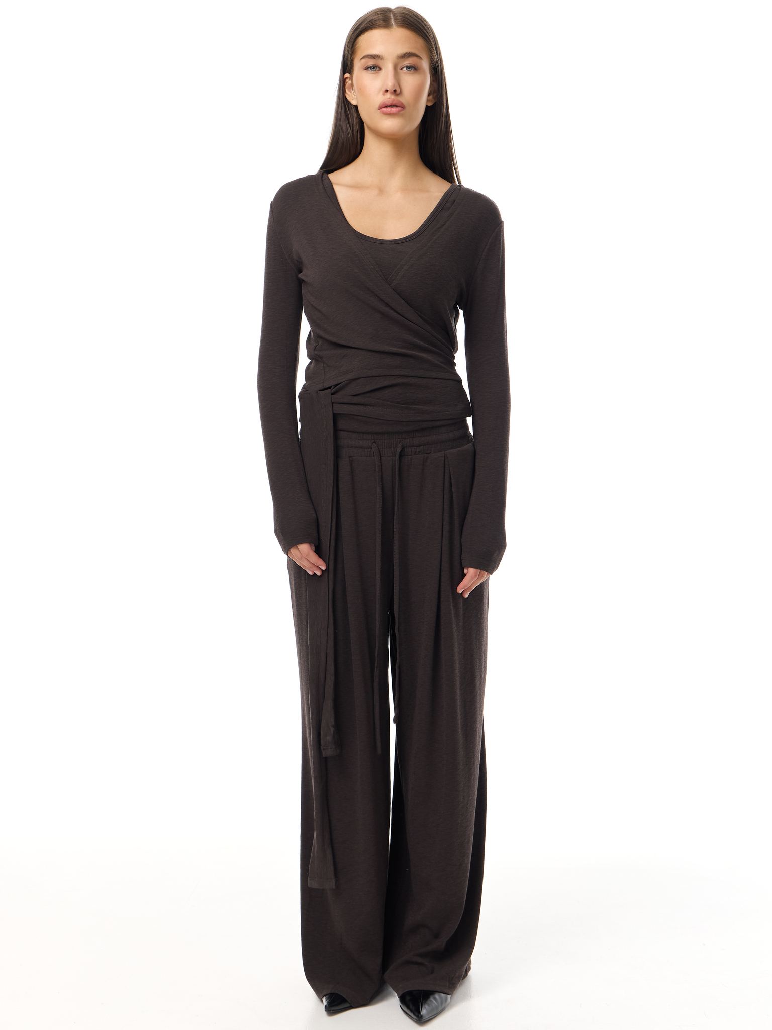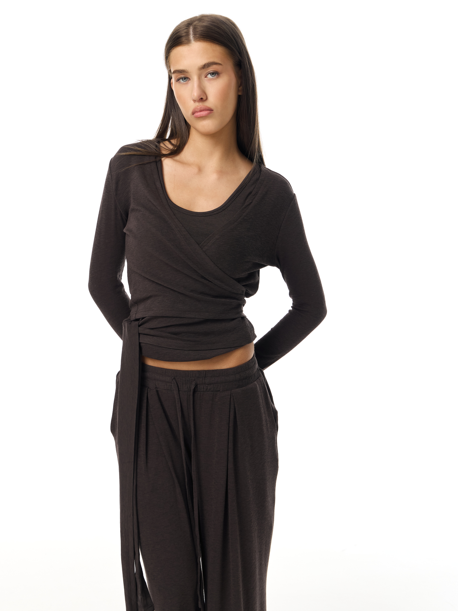 Базовый топ на запах из мягкого трикотажа. Длинные завязки позволяют фиксировать посадку разными способами, подчеркивая талию и создавая изящный силуэт. Лаконичный крой и глубокий вырез делают модель универсальной основой для многослойных образов.