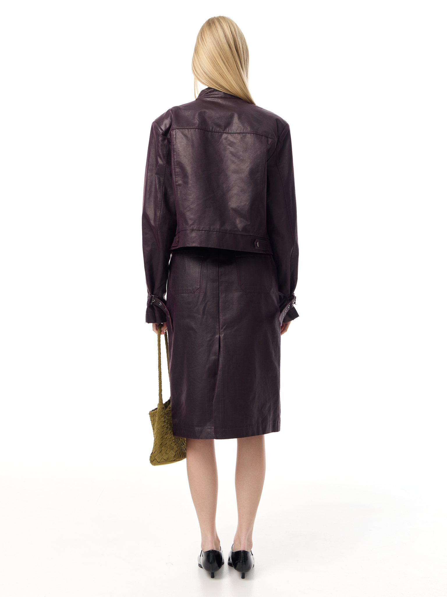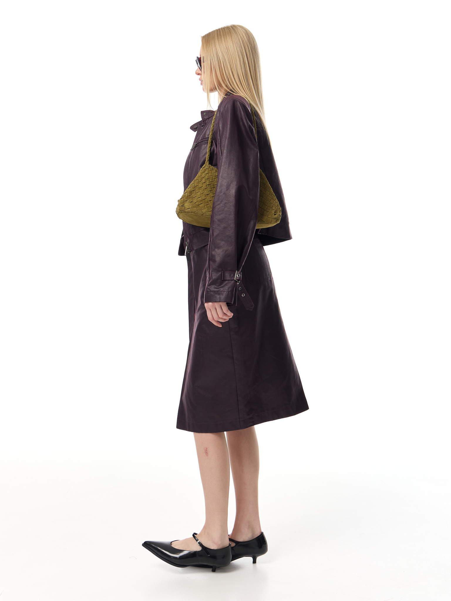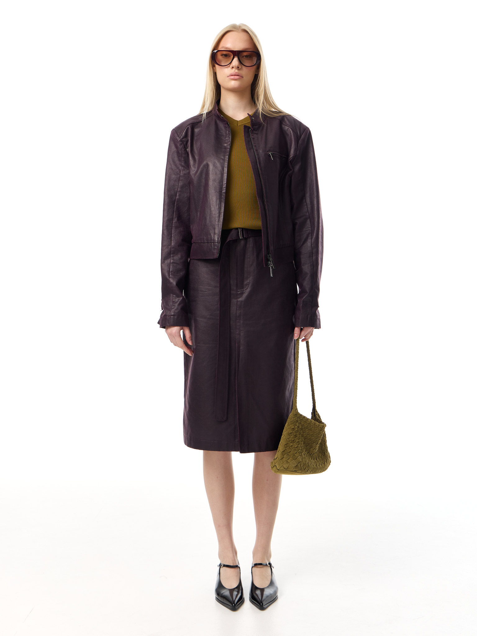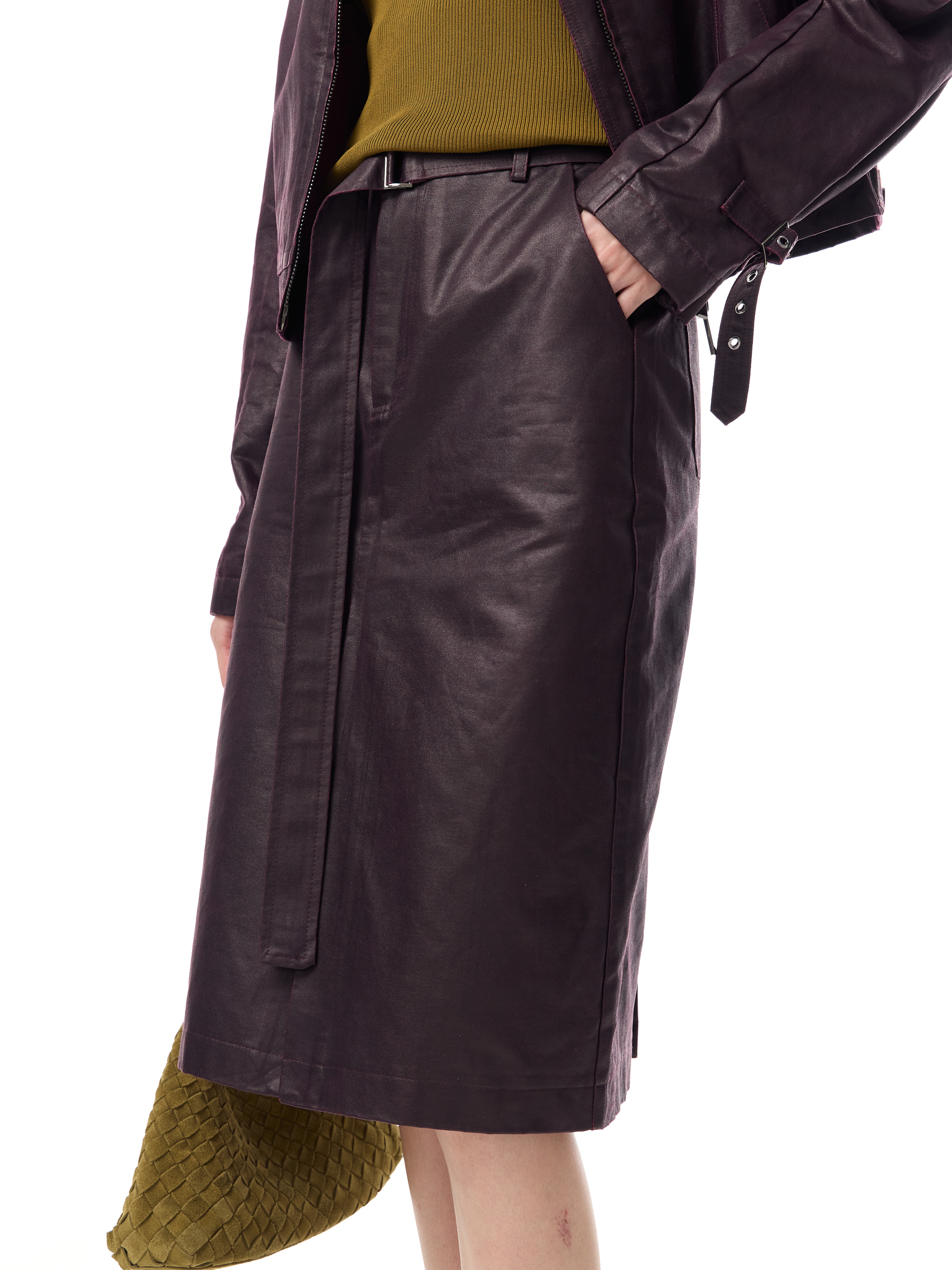 Прямая юбка миди из эко-кожи в насыщенном оттенке бургунди. Плотный материал держит форму и подчёркивает чистый силуэт. Застёжка на молнию и пуговицу, пояс с пряжкой и шлёвками для ремня. Боковые карманы добавляют практичности, а разрез сзади обеспечивает свободу движения.