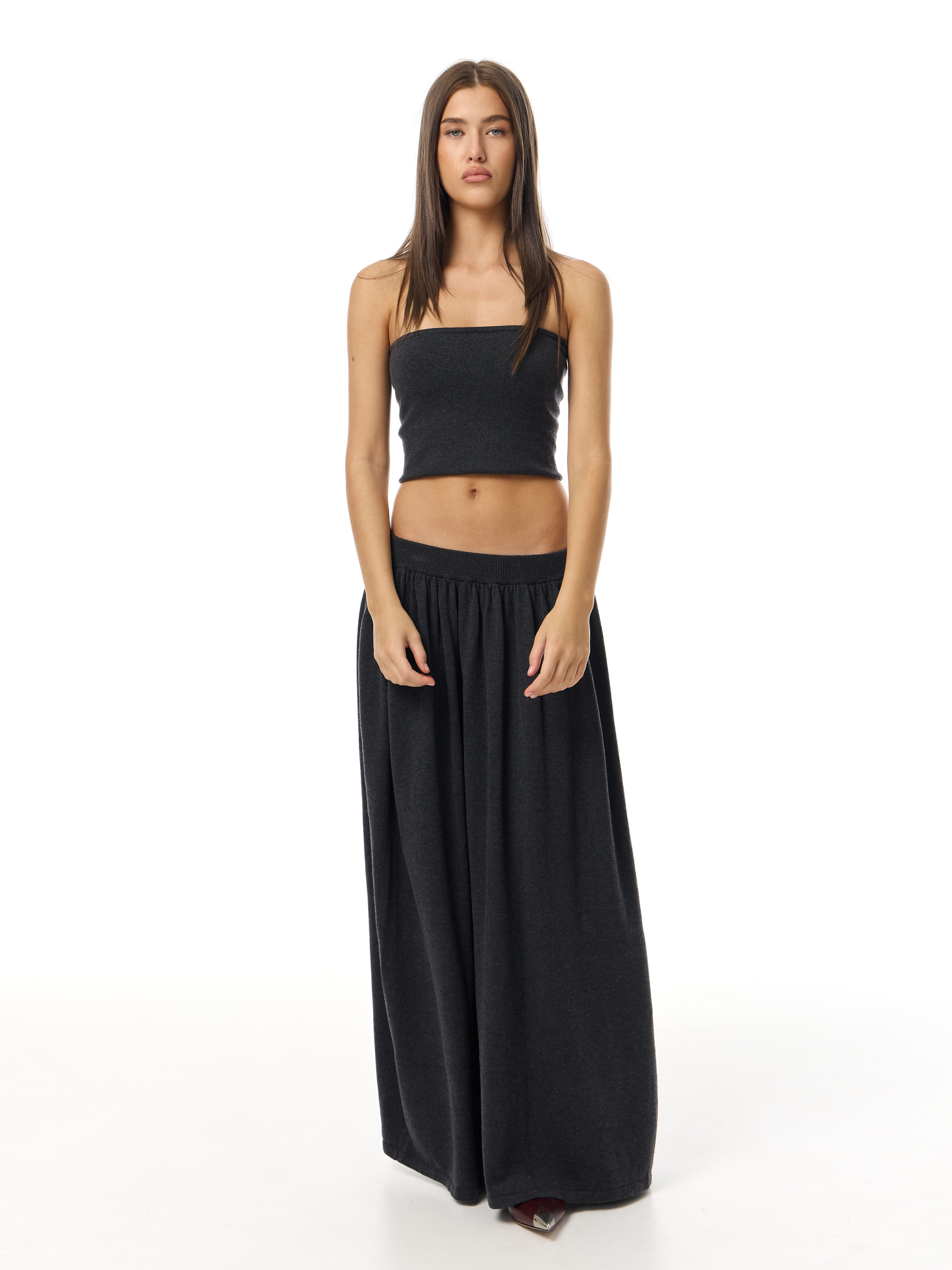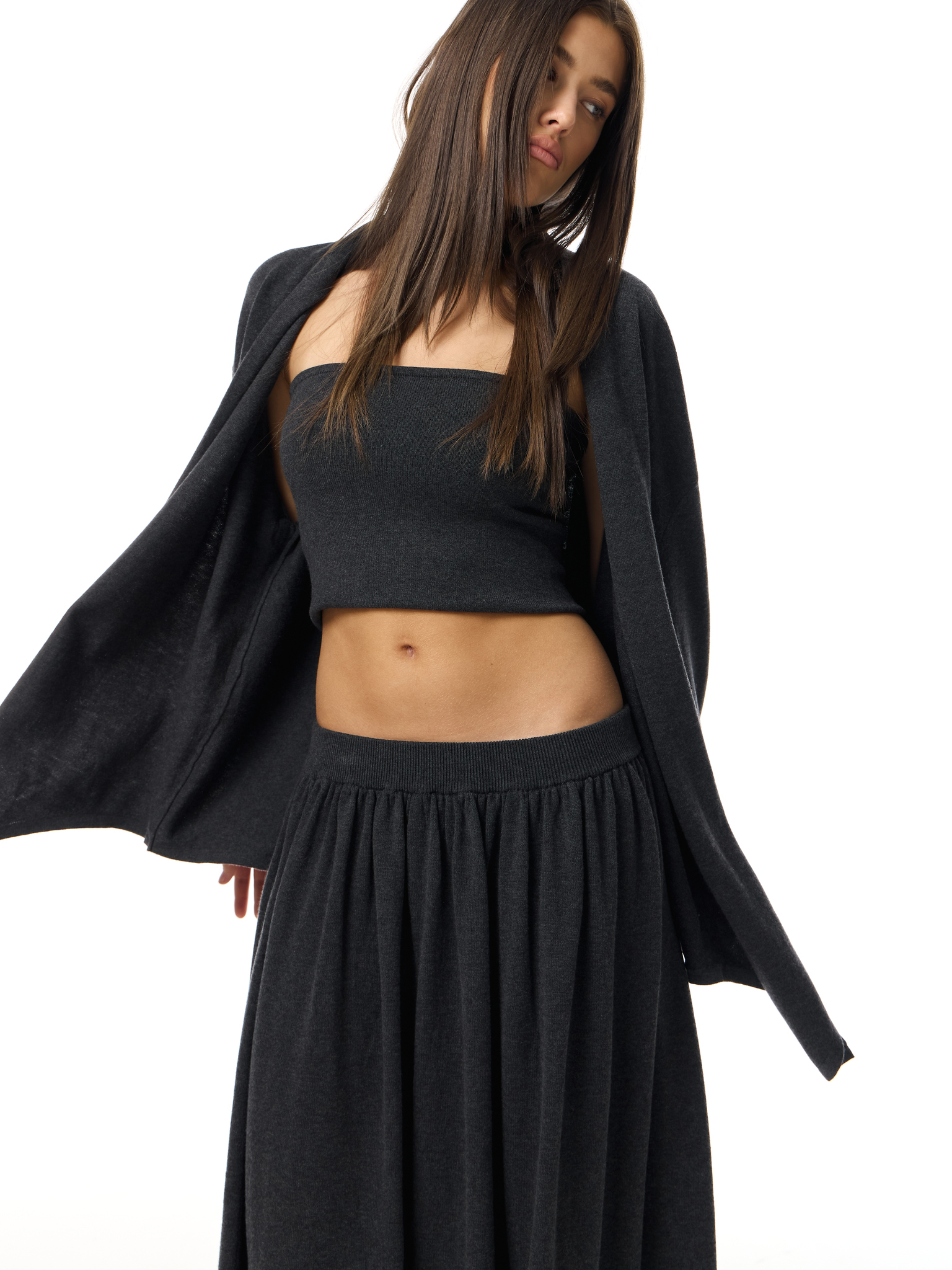 Макси-юбка из мягкой трикотажной ткани с широкой эластичной талией. Свободный силуэт и лёгкая драпировка создают плавное движение и комфорт в носке. Лаконичный дизайн делает модель универсальной базой для повседневных и вечерних образов.