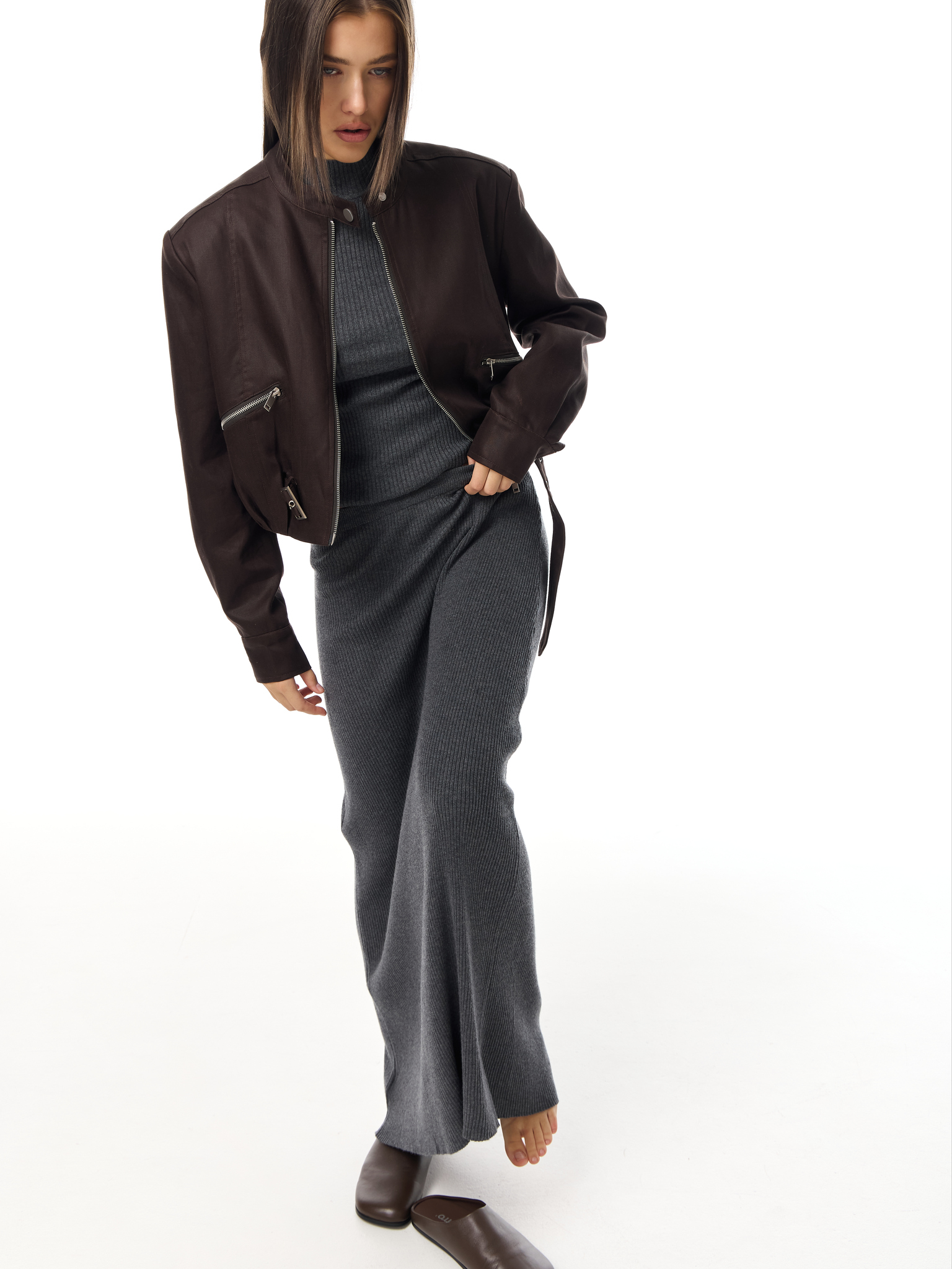 Длинная трикотажная юбка прямого кроя в рубчик. Эластичный пояс мягко фиксирует посадку, обеспечивая комфорт и свободу движения. Универсальная база для минималистичных и многослойных образов.