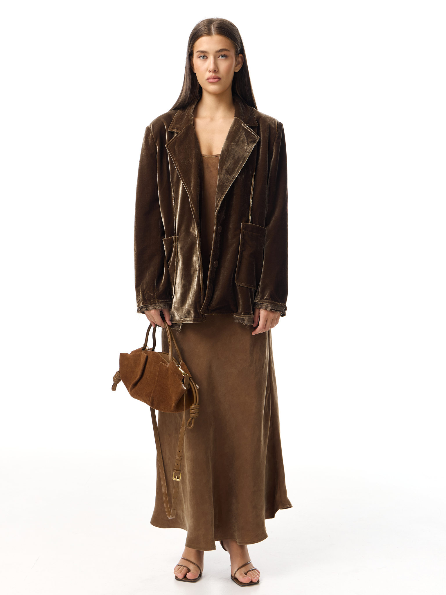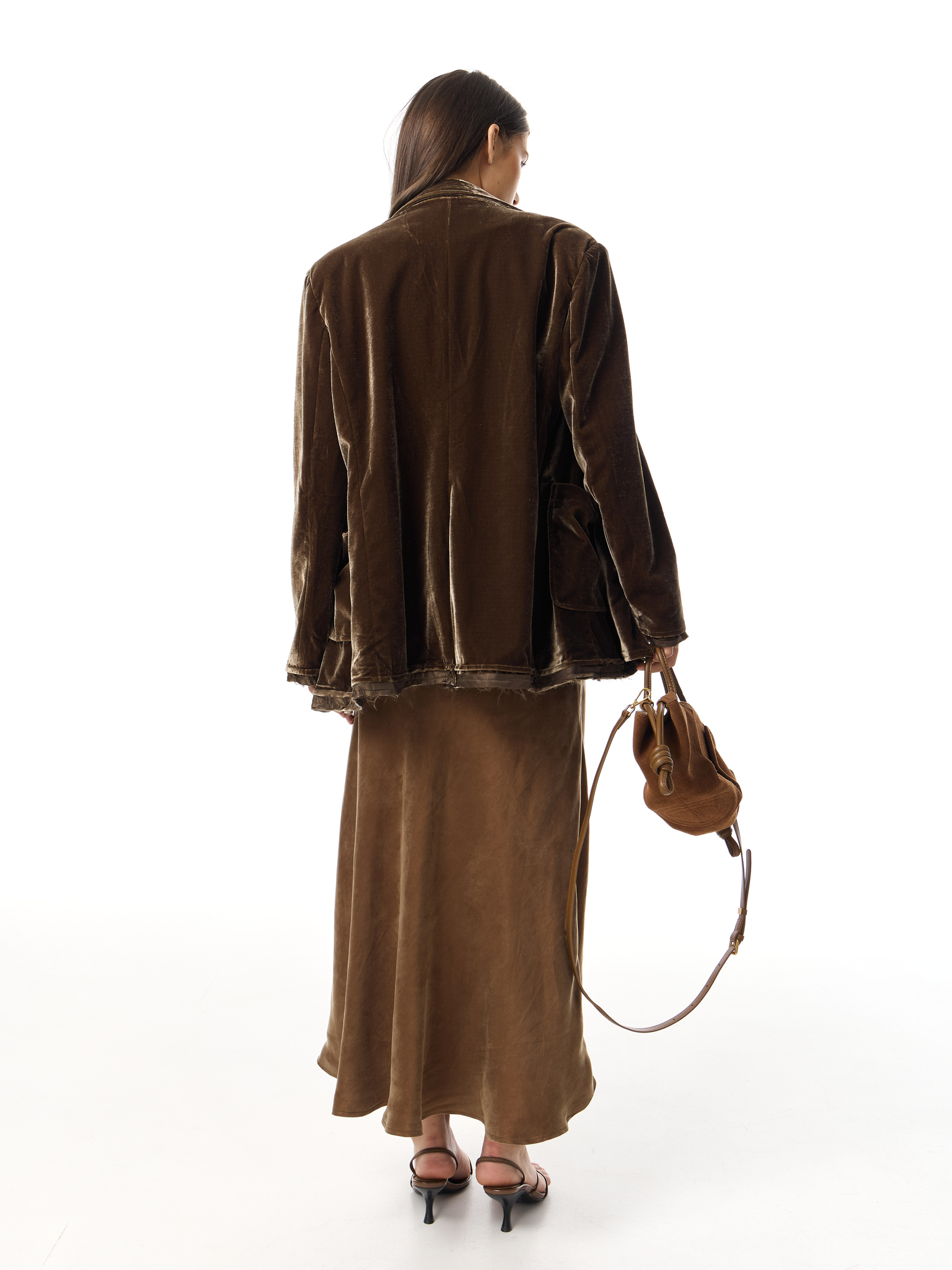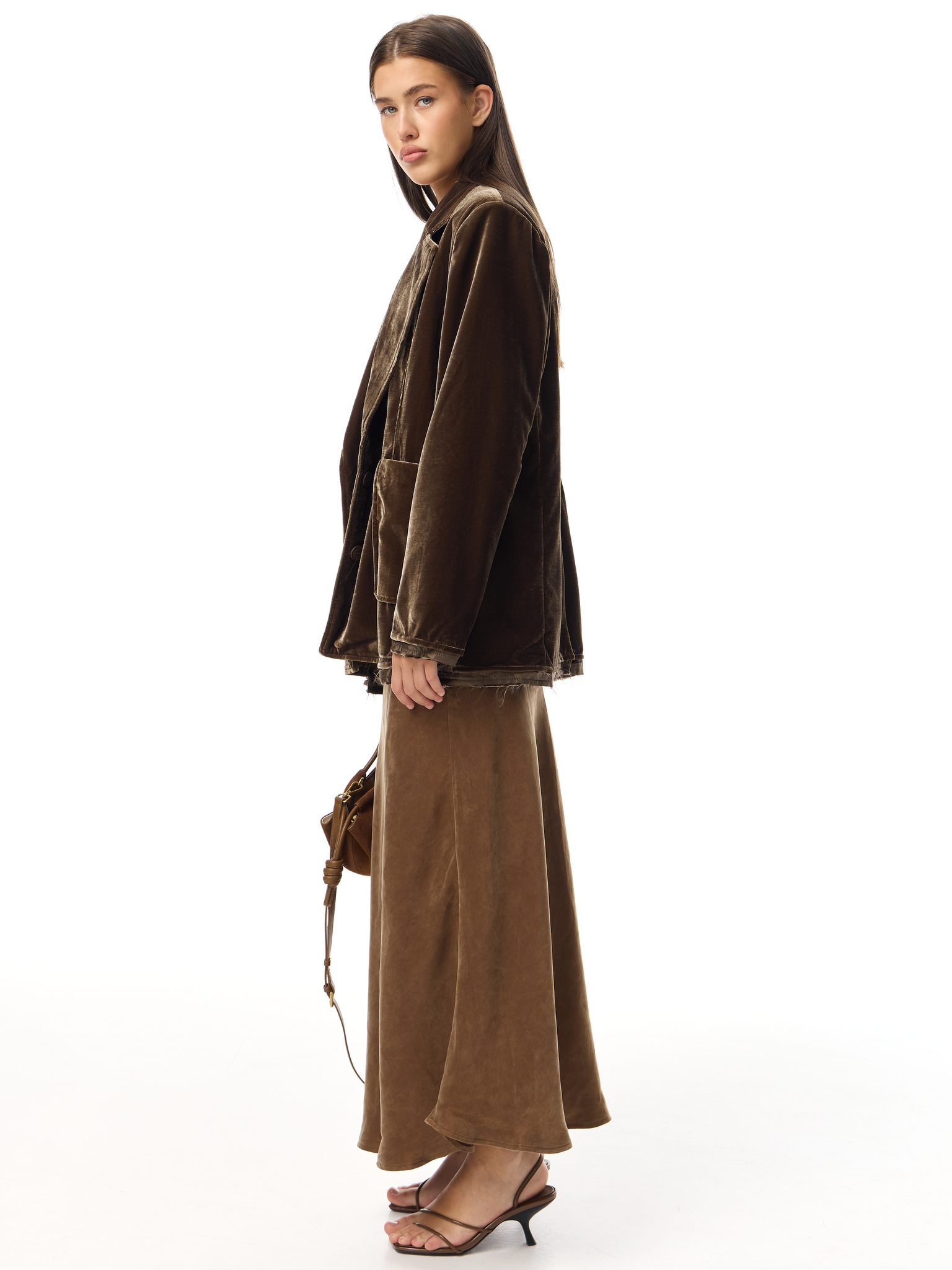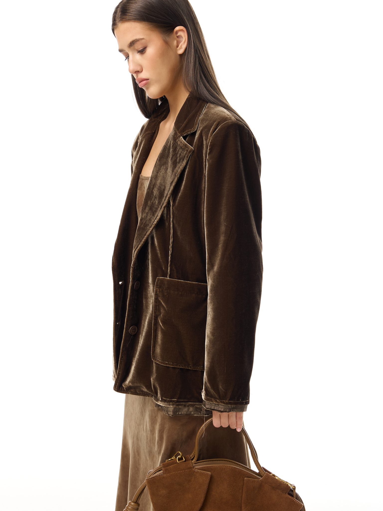 Жакет из мягкого бархата прямого кроя. Лацканы с классическим отворотом, длинные рукава. По бокам — объёмные накладные карманы. Ткань с характерным блеском подчеркивает глубину оттенка и фактуру.